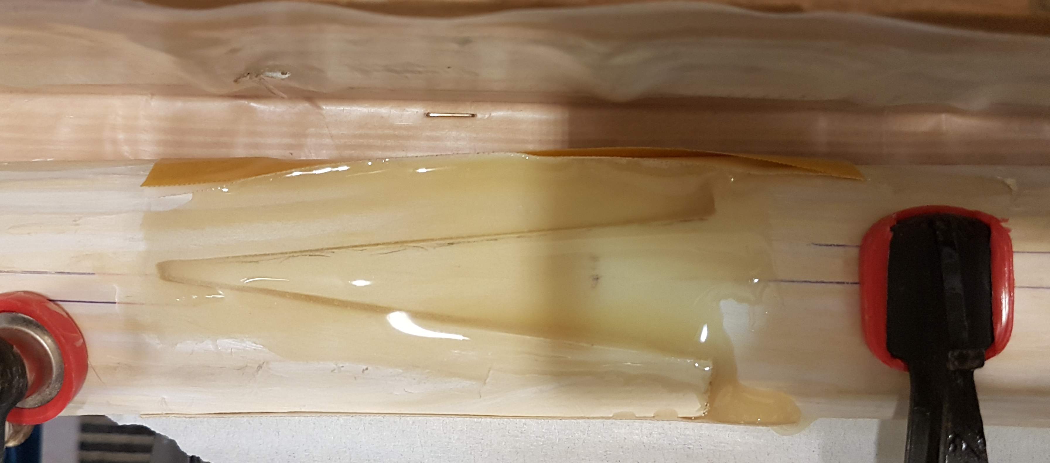 Bogen 02 lang. Gestern Abend hatte ich die Spleiße mit Hilfe der Bandsäge geschnitten. Da die Schnitte mal wieder nicht gut waren und meine Mittellinie nicht optimal gewesen wäre, habe ich die Spleißteile noch etwas nachgeraspelt und eben gerade mit Epoxyd geklebt. Jetzt stimmt die Mittellinie wieder.