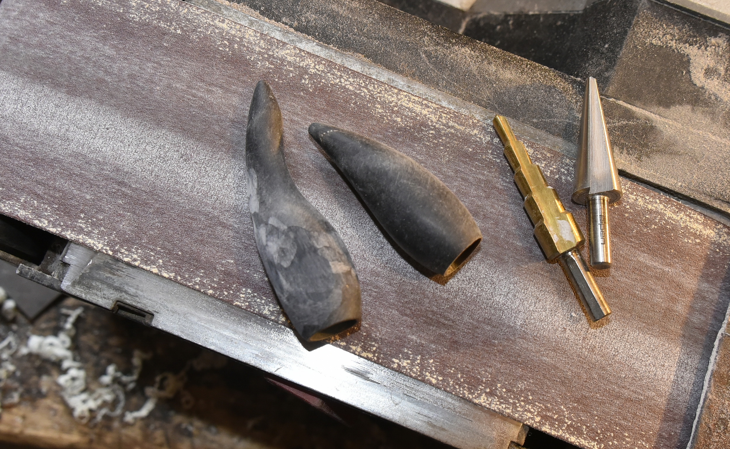 Die Hornnocken gebohrt und mit dem Bandschleifer in Form gebracht, da läuft alles nach Plan.