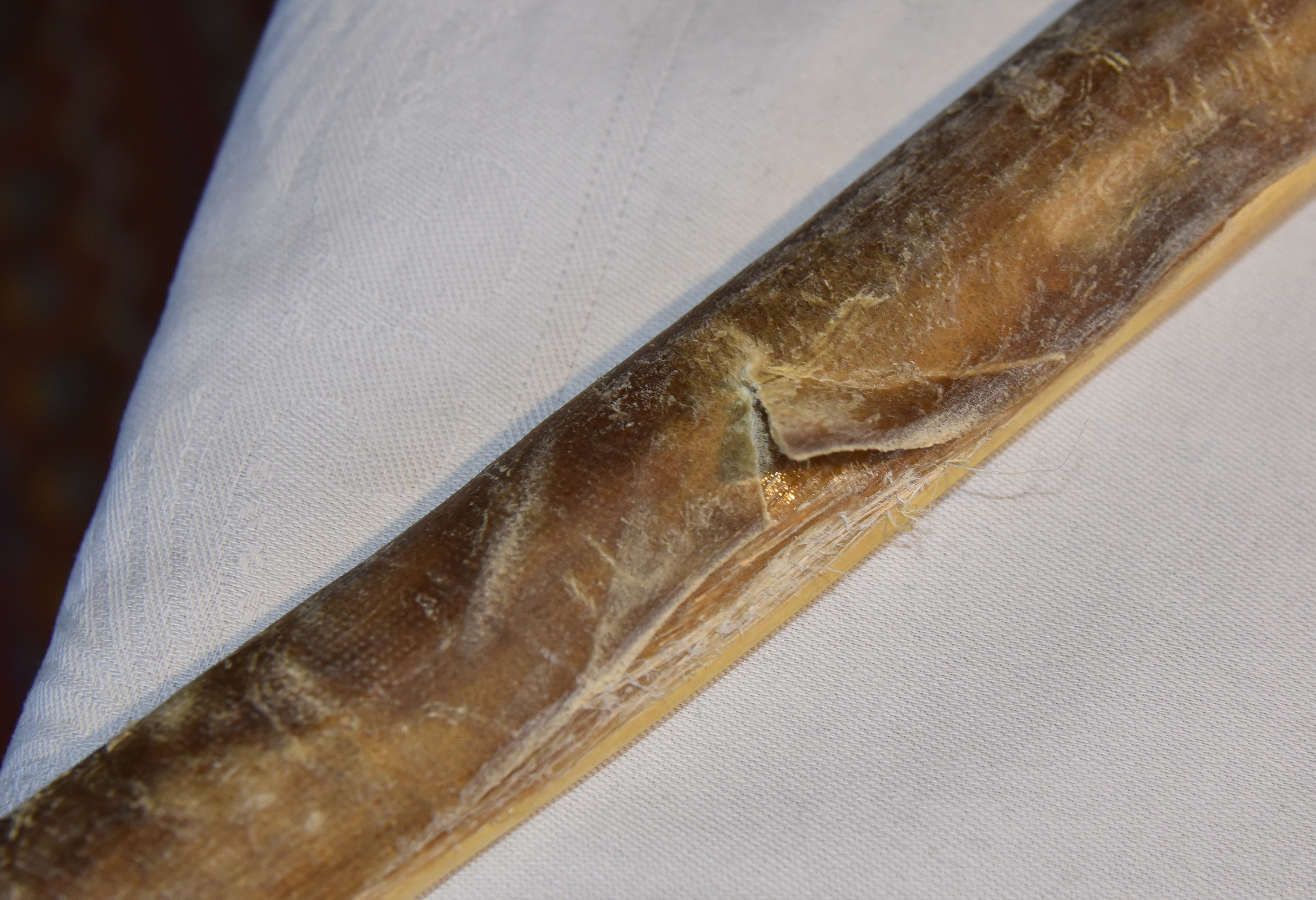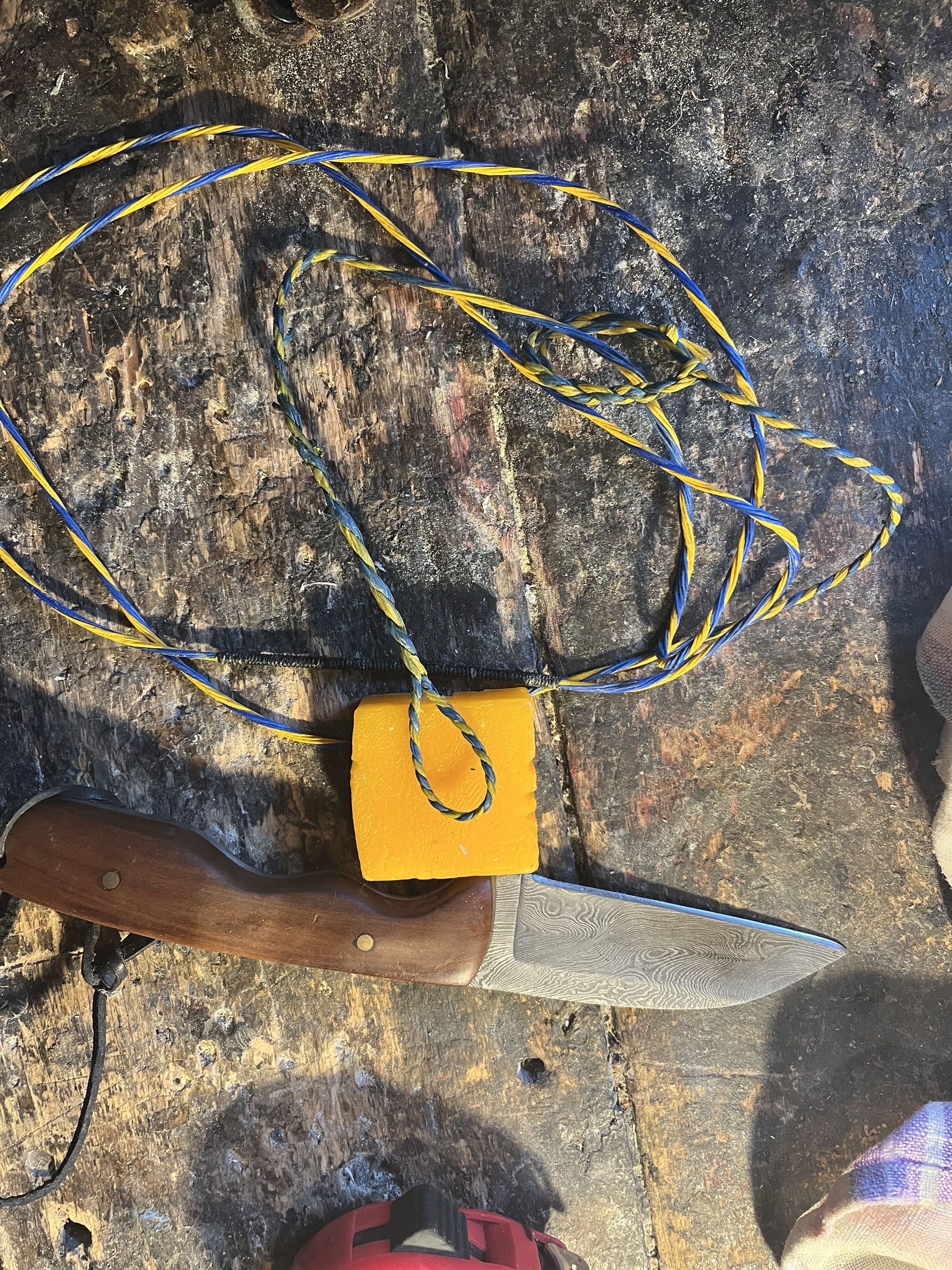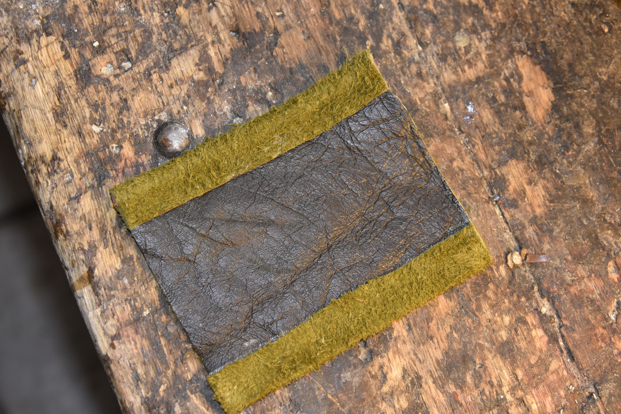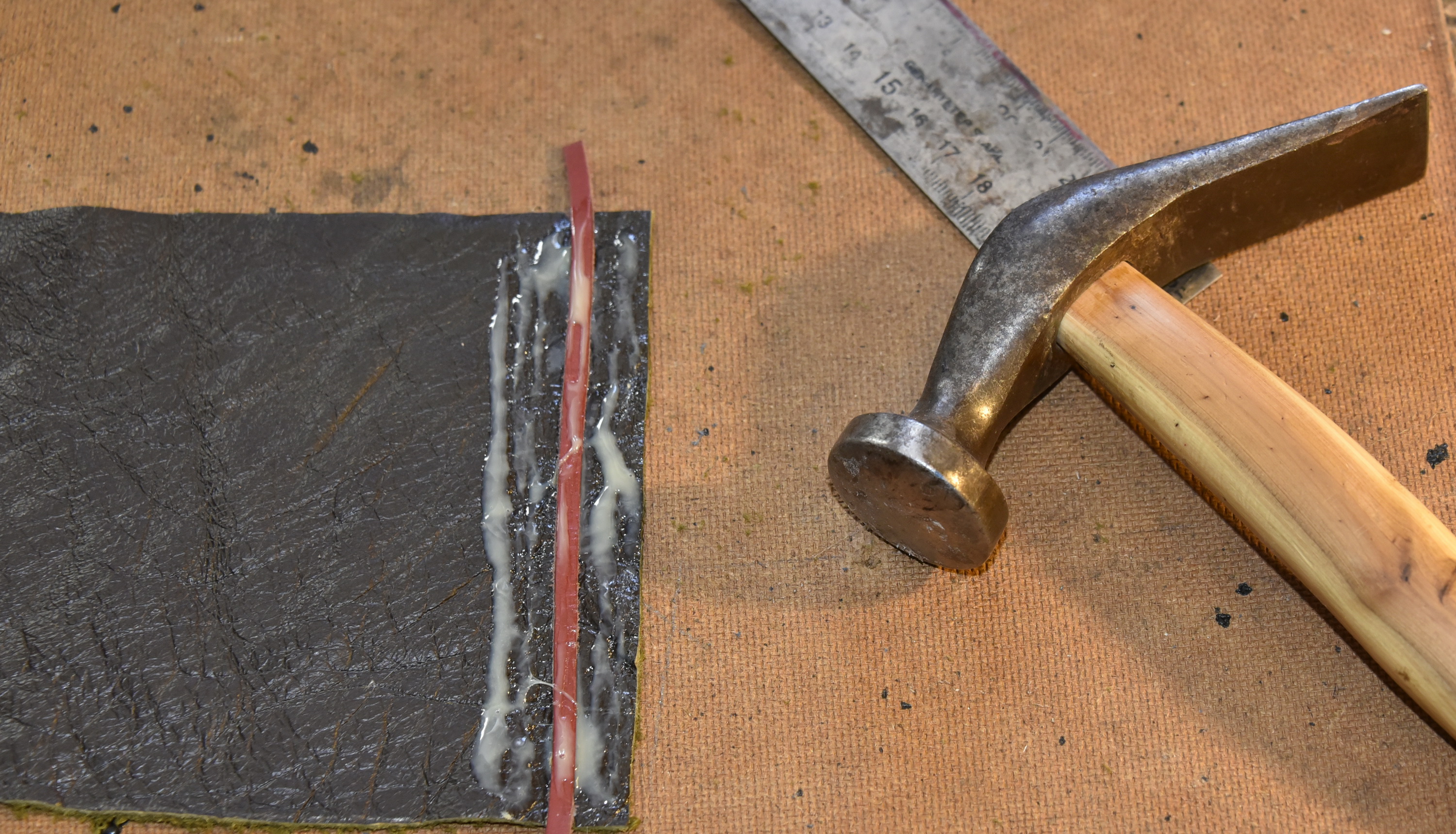 Ich hab dann noch ein paar Sehnen geklopft und an der Stelle aufgebracht, dann eine Rohhaut zugeschnitten und wieder grundiert und gewickelt.
