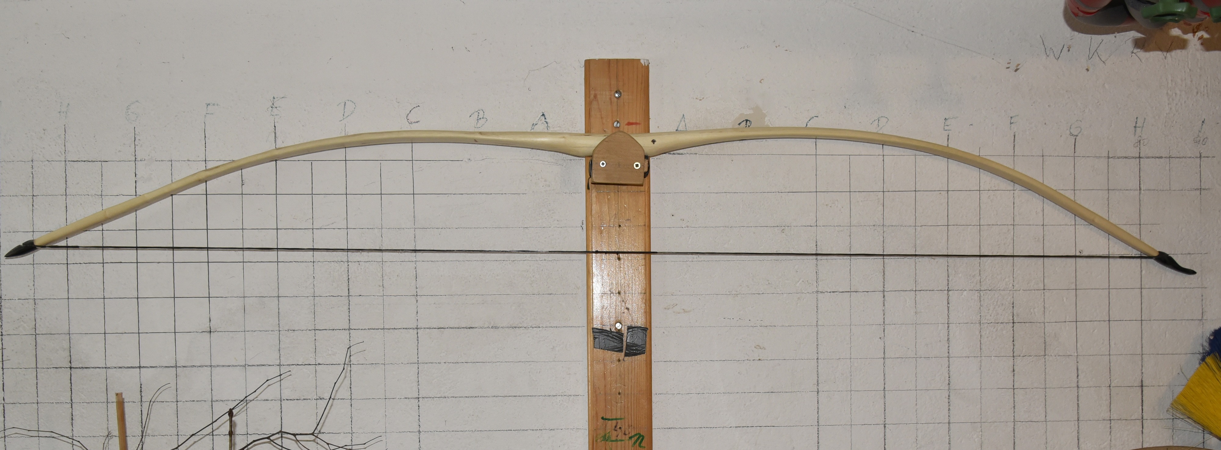 Der Bogen auf Standhöhe liegt nicht mit dem Druckpunkt in der Mitte. Da der Bogen ja 180cm lang ist, dürfte er beim Ausziehen dann von E bis fast G etwas mehr biegen, wird ein schöner Parcourbogen!