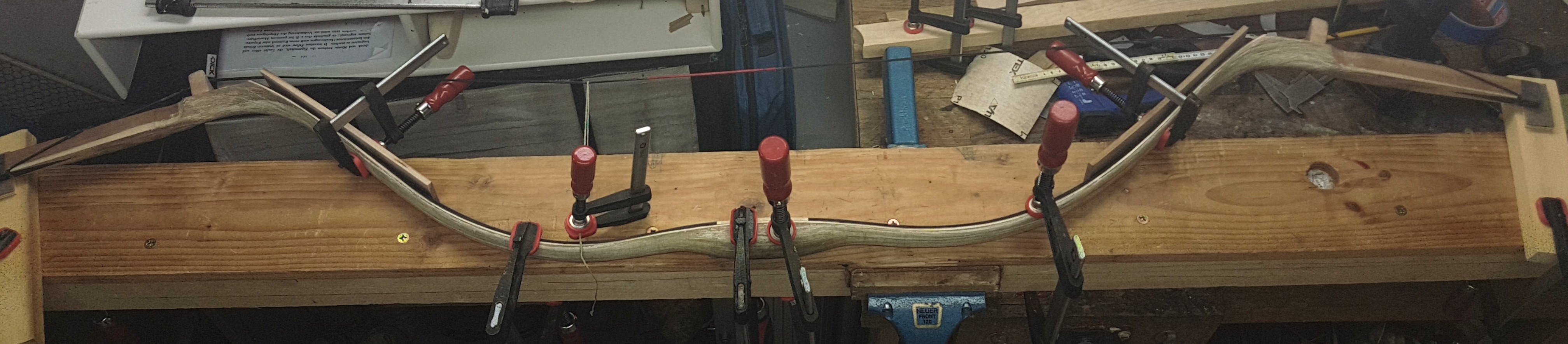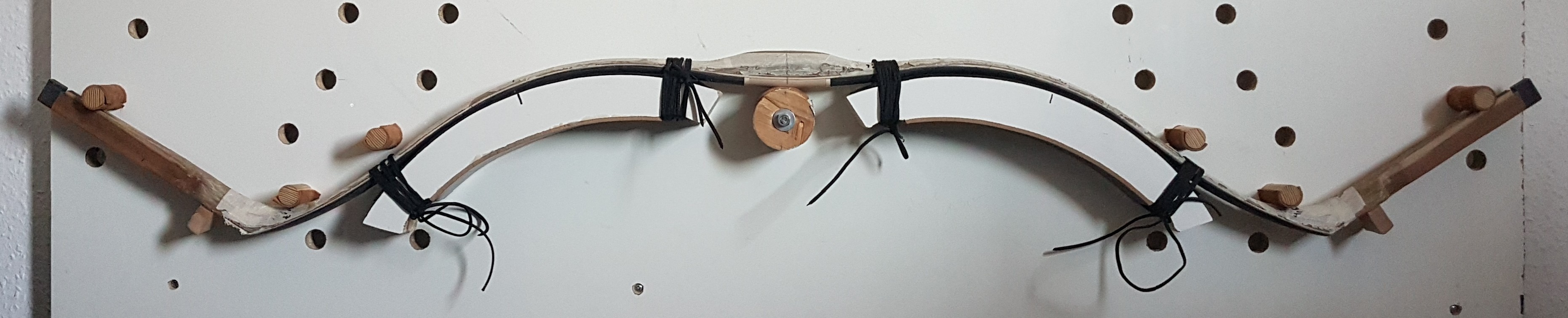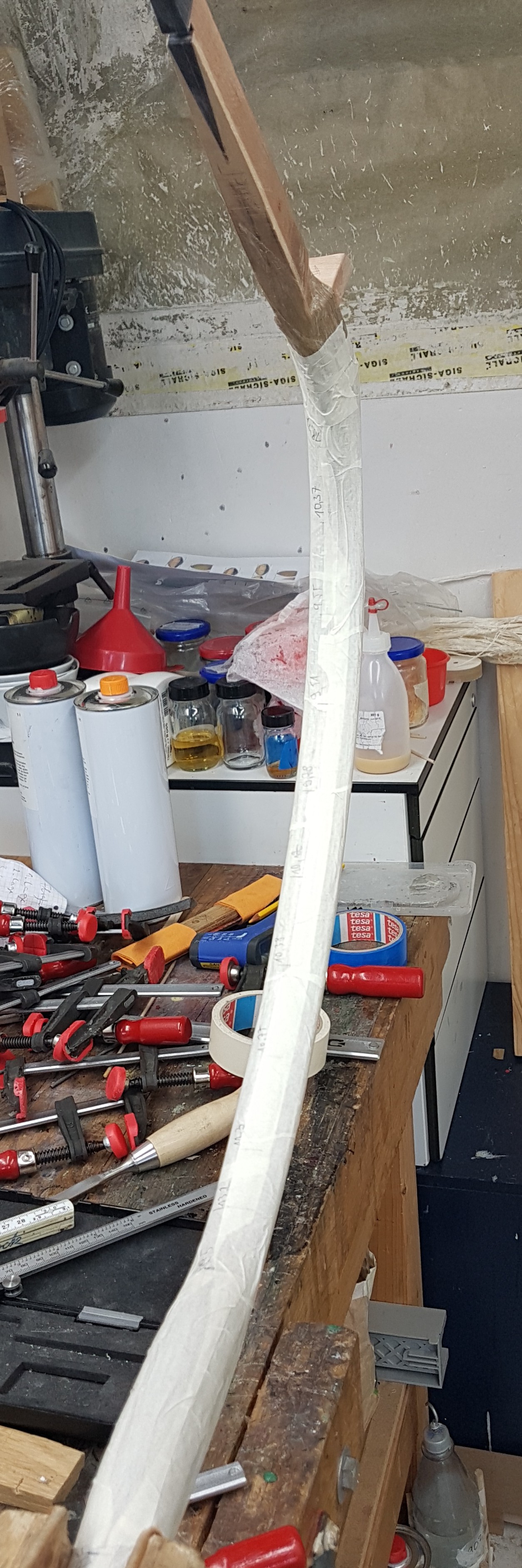 Ich werde jetzt den Rahmen bauchseitig abschleifen und Horn mit Epoxid aufkleben. Der Bogen ist zwar recht schmal mit ca. 35 mm, aber dafür ist Kern und Sehnenlage gut und viel zu schade um das Konstrukt komplett zu verwerfen.