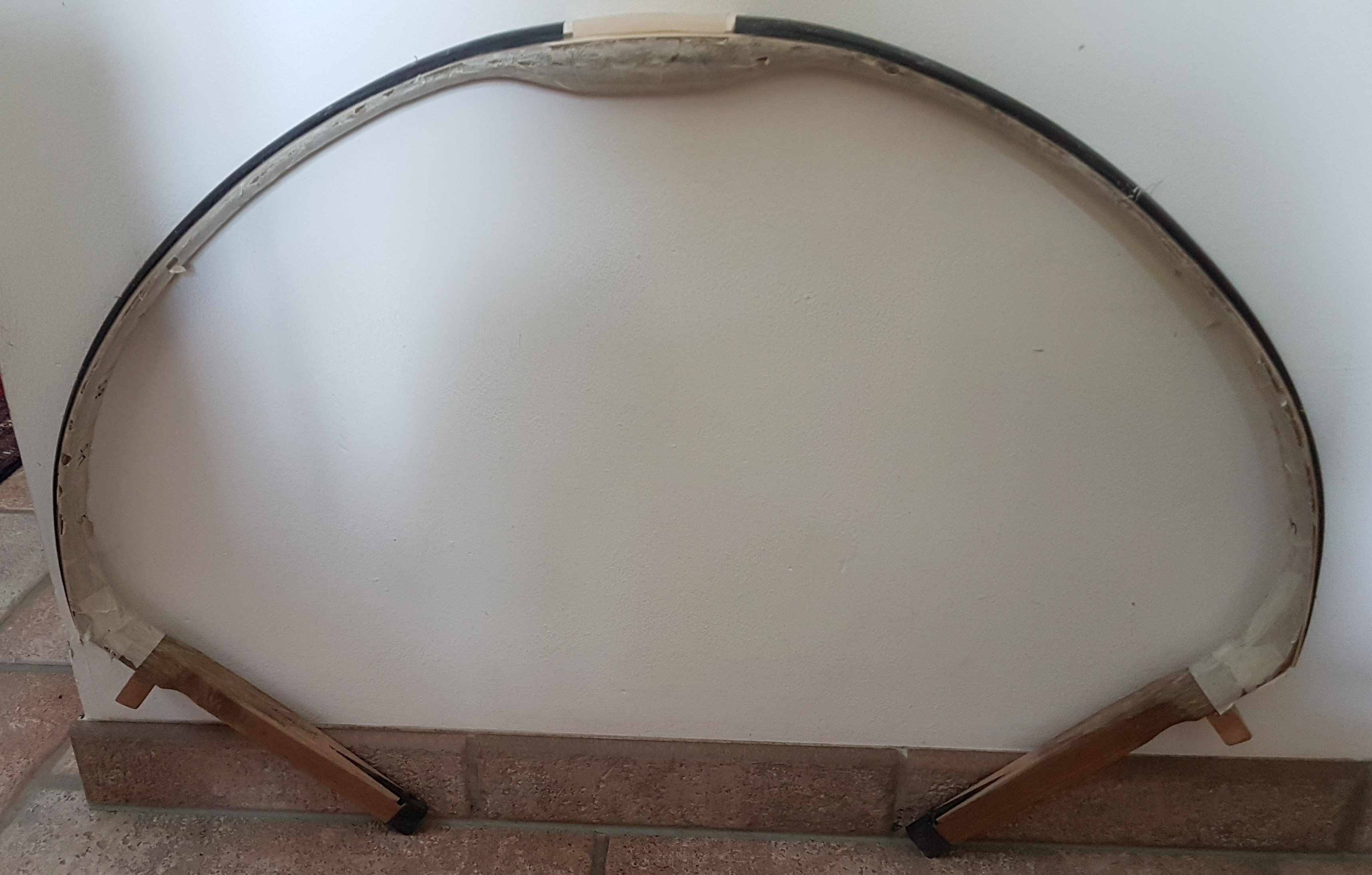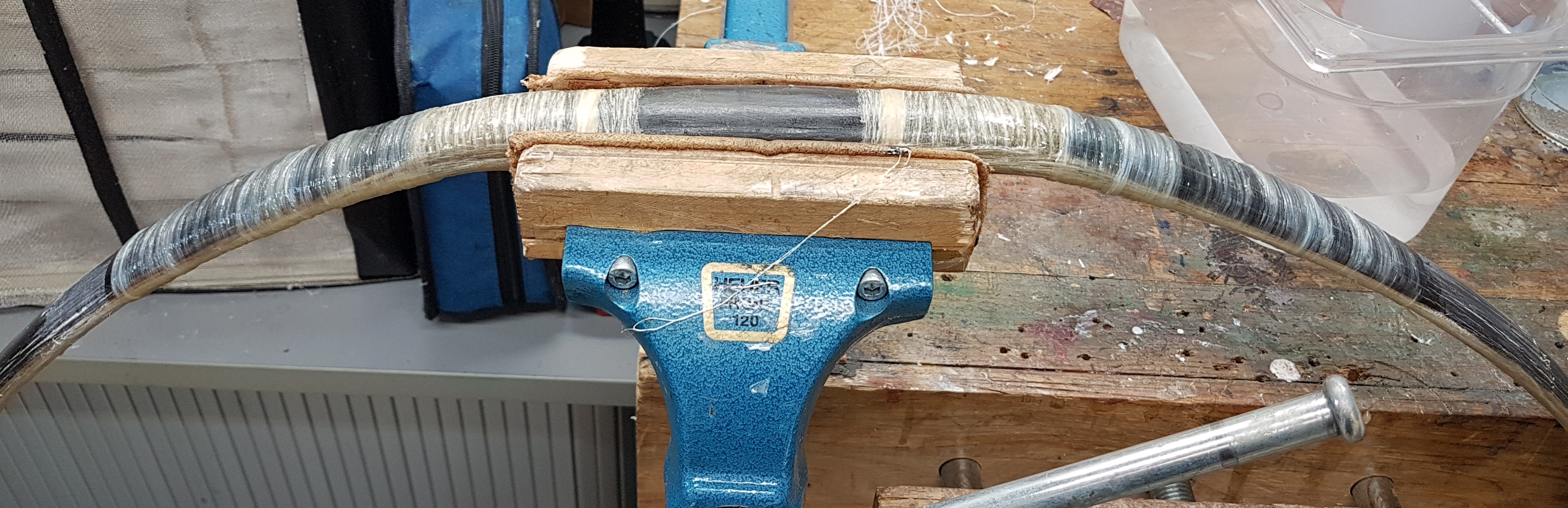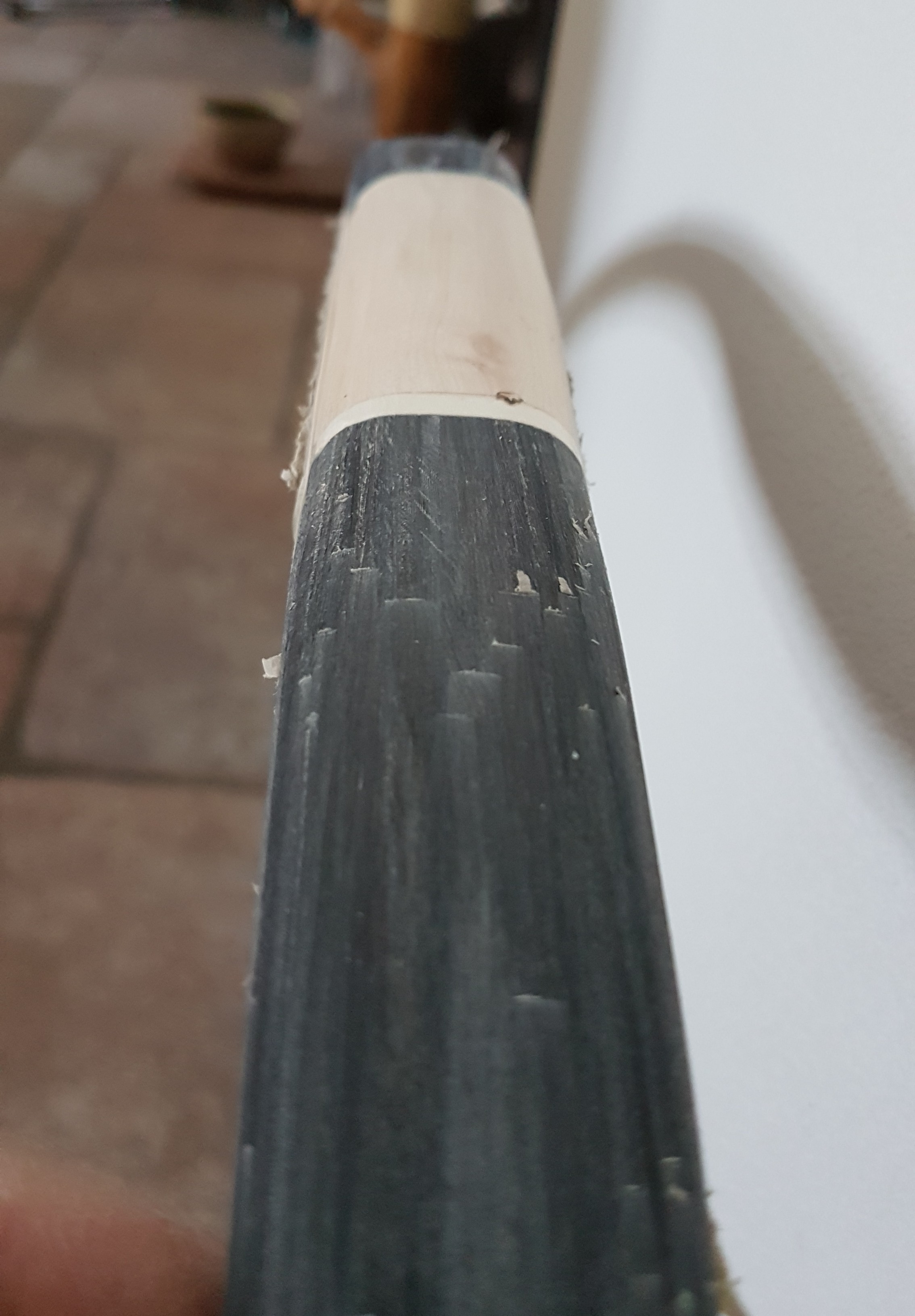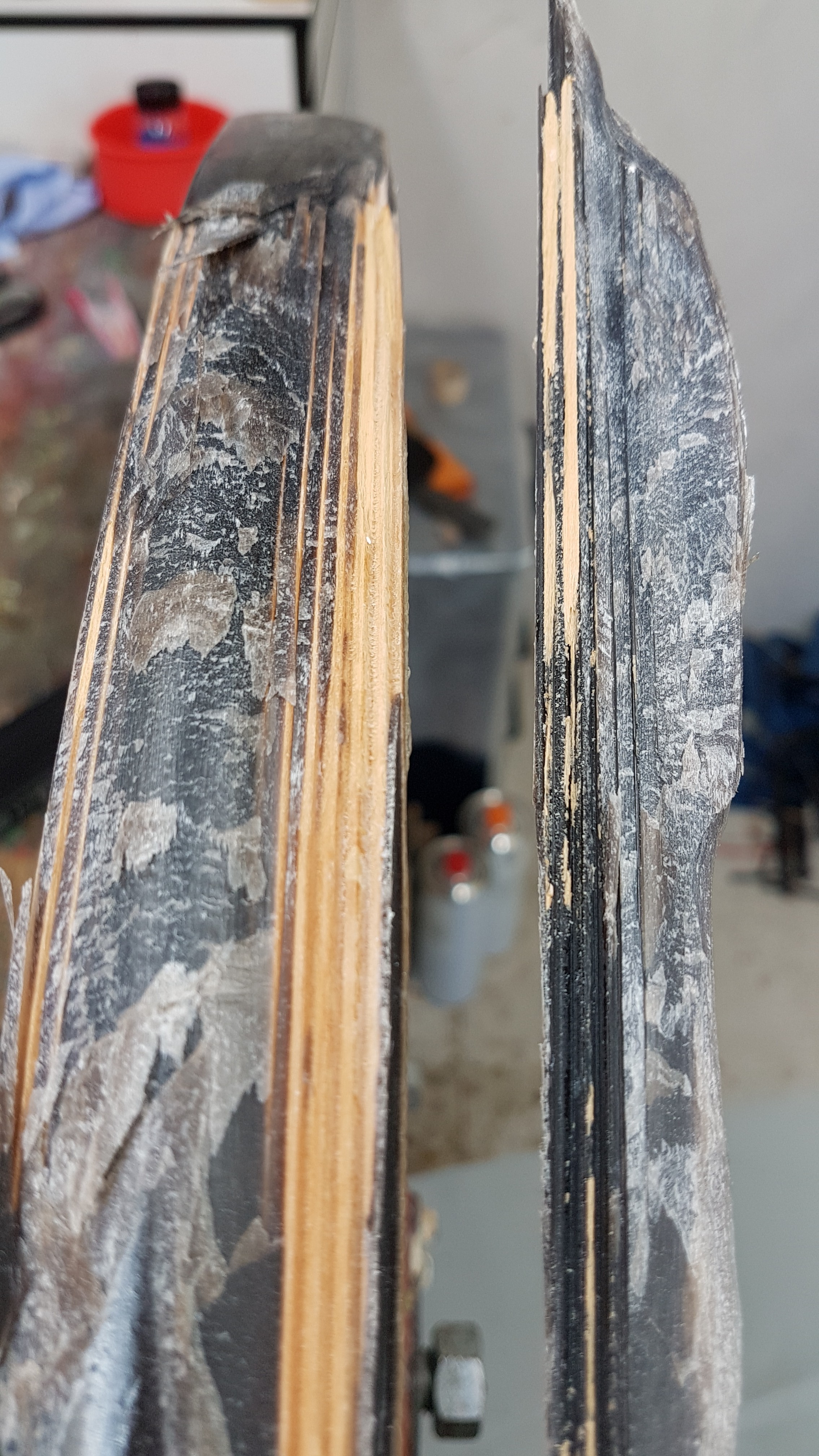 Ich werde jetzt den Rahmen bauchseitig abschleifen und Horn mit Epoxid aufkleben. Der Bogen ist zwar recht schmal mit ca. 35 mm, aber dafür ist Kern und Sehnenlage gut und viel zu schade um das Konstrukt komplett zu verwerfen.