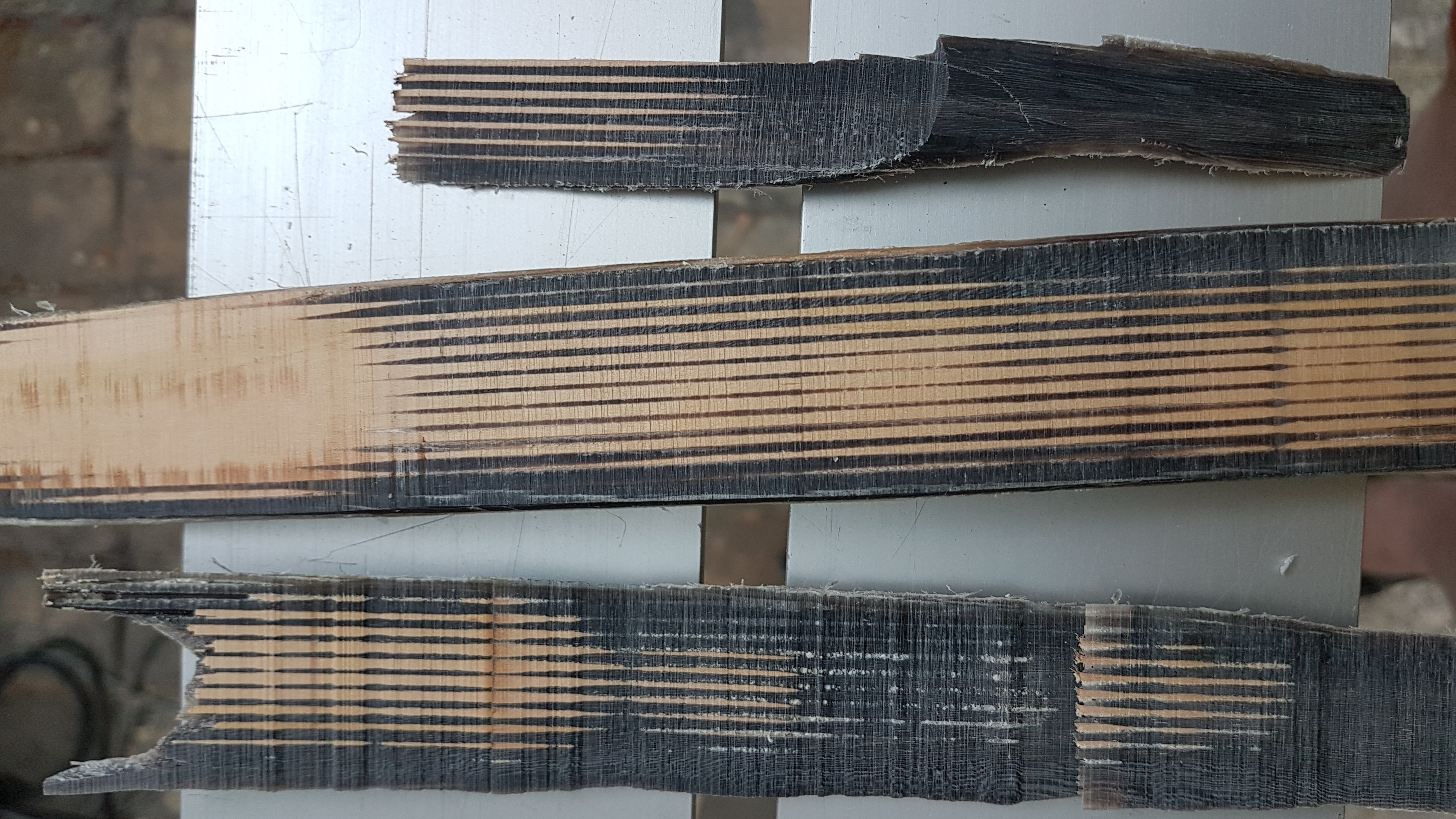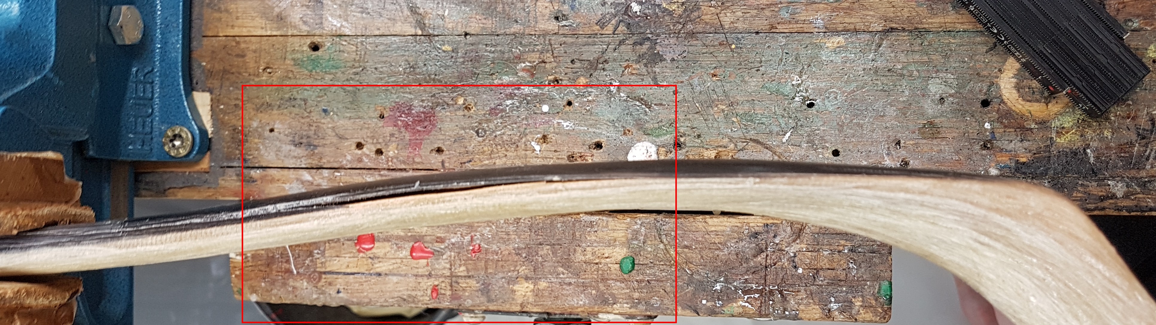 Vorhin habe ich wieder aufgespannt. Dabei hat sich der ganze Bogen noch mehr seitlich verzogen. Beim Gegenbiegen hat es dann geknackt. Wieder eine Stelle mit schlechter Verklebung, die wohl auch für die seitliche Abweichung verantwortlich war.