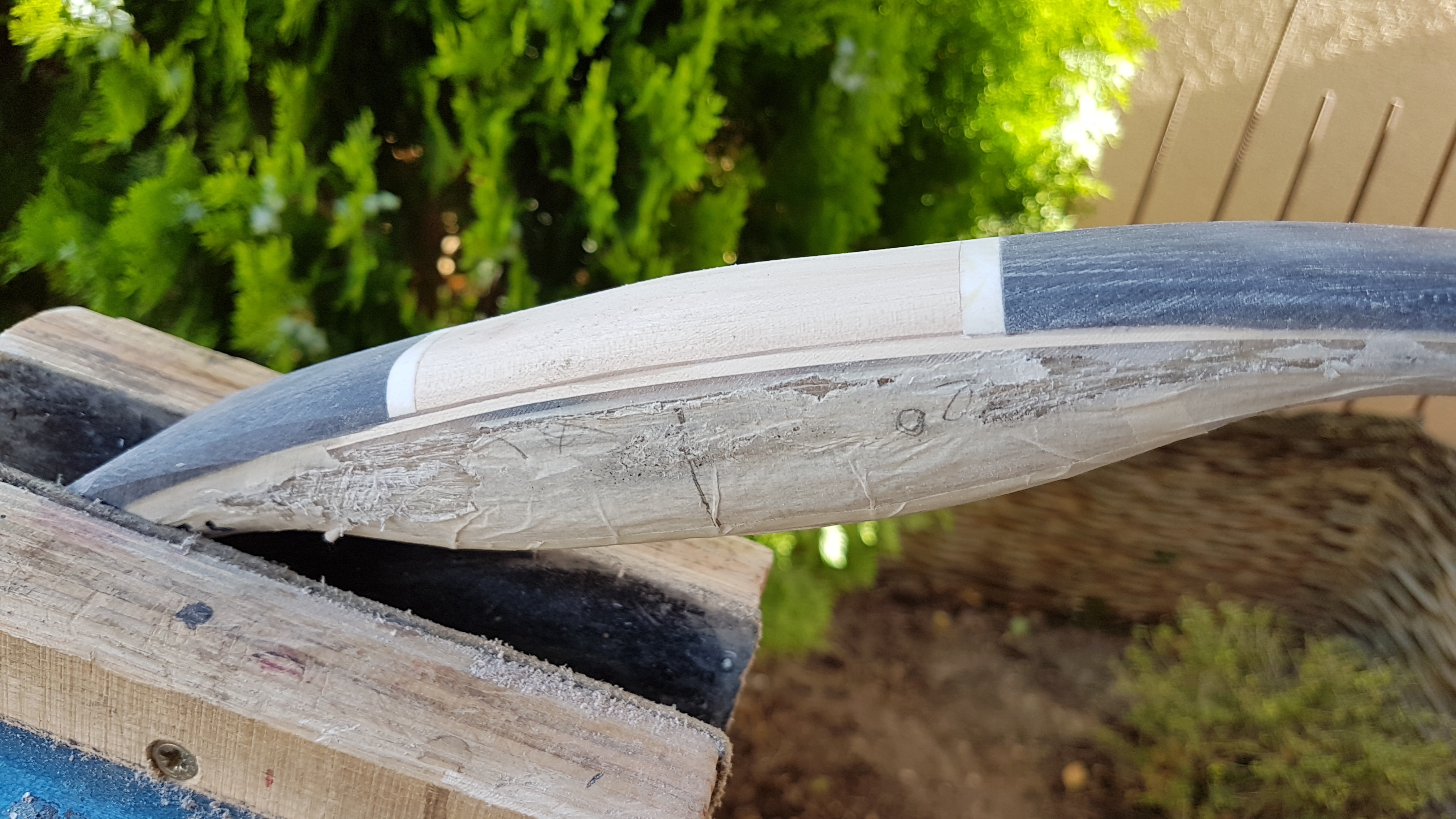 Die Hornstreifen sind geklebt (UHU Plus Endfest 300). Zunächst habe ich die seitlichen Überstände entfernt, dann die WA und den Griff abgerundet. Dann angefangen zu tapern. Ich werde in etwa 2 mm Dickentaper vornehmen (ab Fadeout bis Ende). Mal sehen ob das passt.