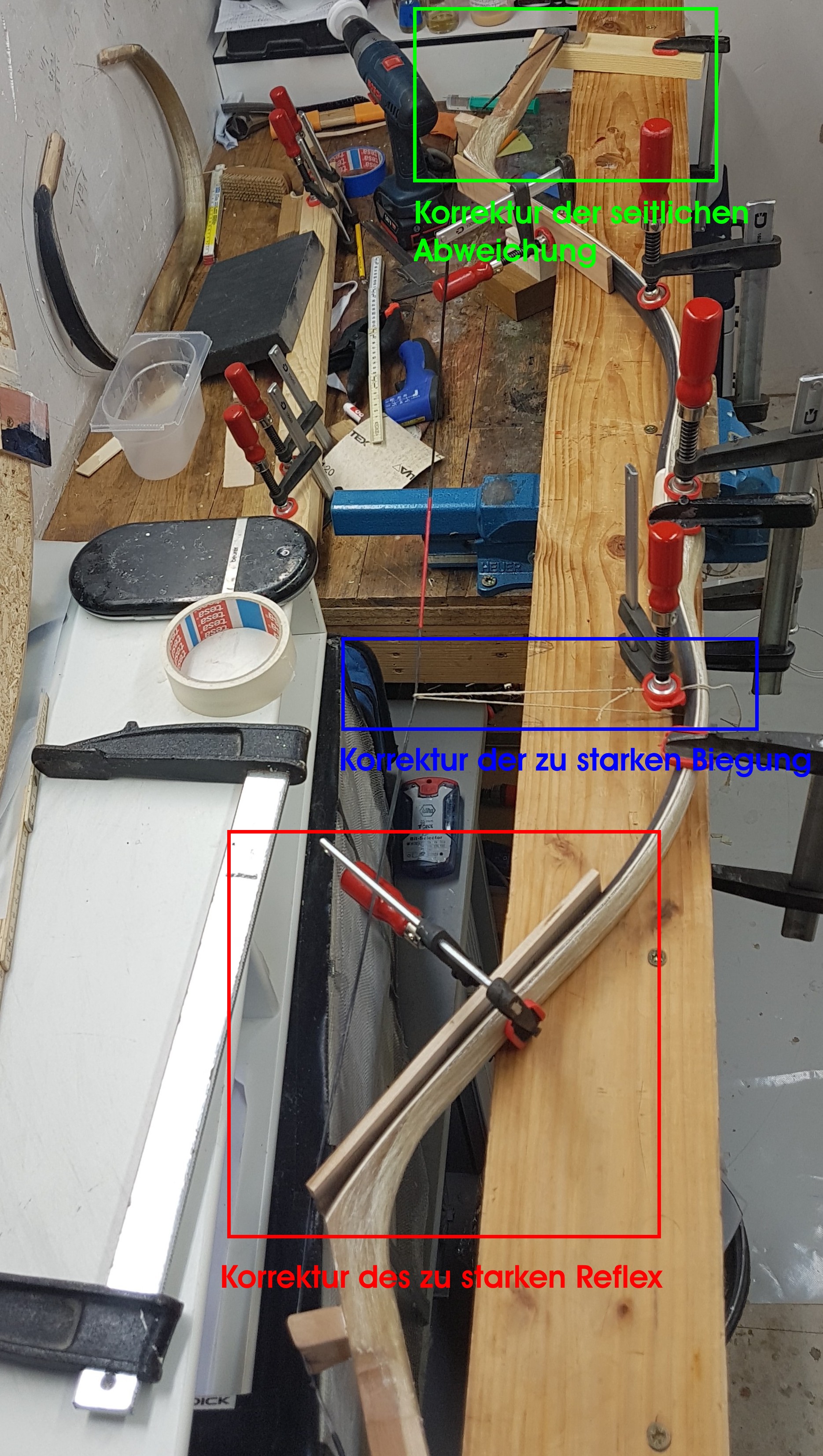 Danach habe ich die Sehnenlage gut abgeklebt und alle 5 cm die Dicke gemessen und vermerkt. Das ist wichtig, da das Horn noch nicht exakt getapert ist. Danach wurde alles gründlich entstaubt und entfettet und nochmals probehalber zusammen gezwungen.