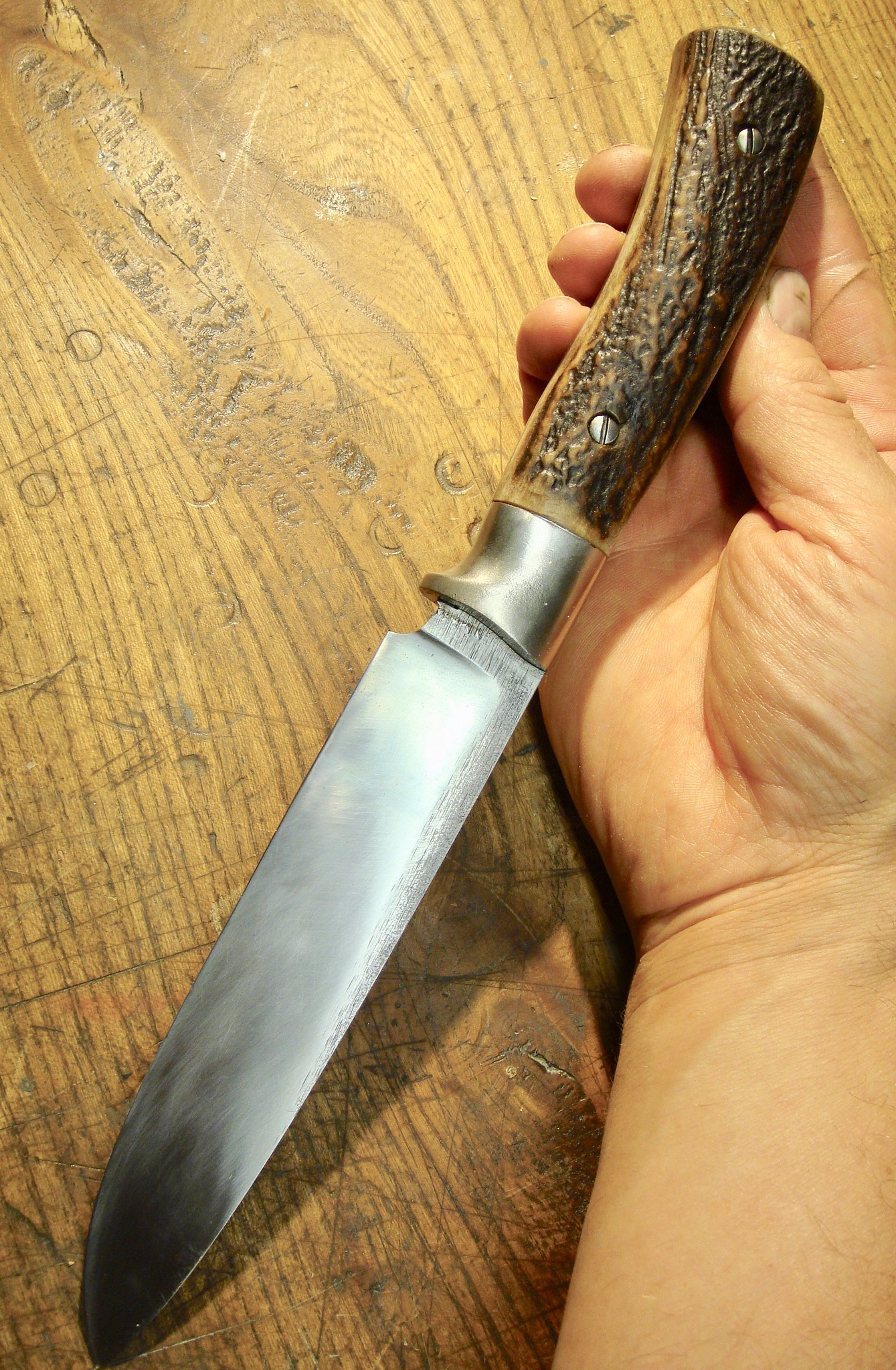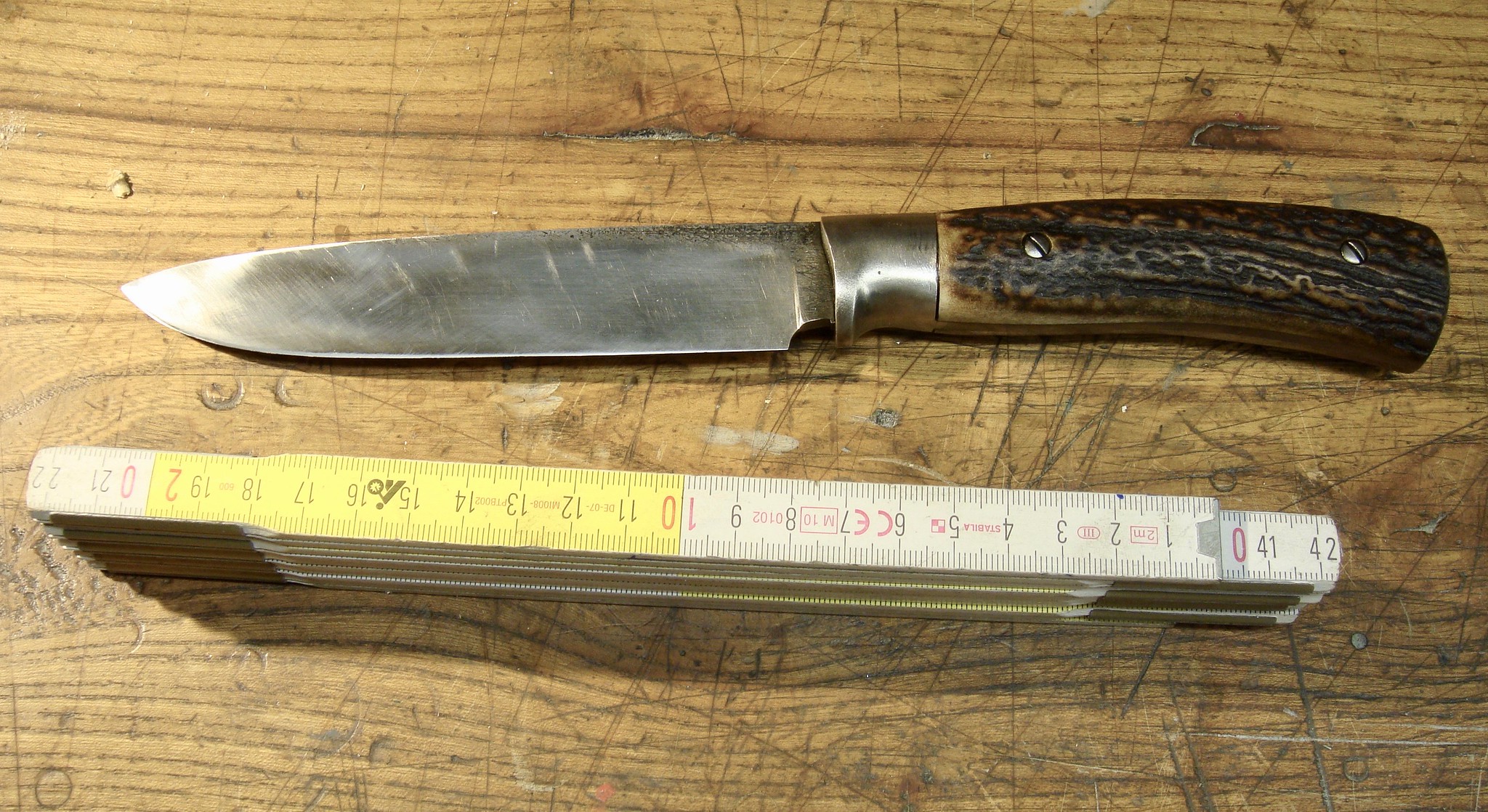 Klinge ist, wie fast immer, Kohlenstoffstahl (1.2842). Der Griff ist Hirschhorn.