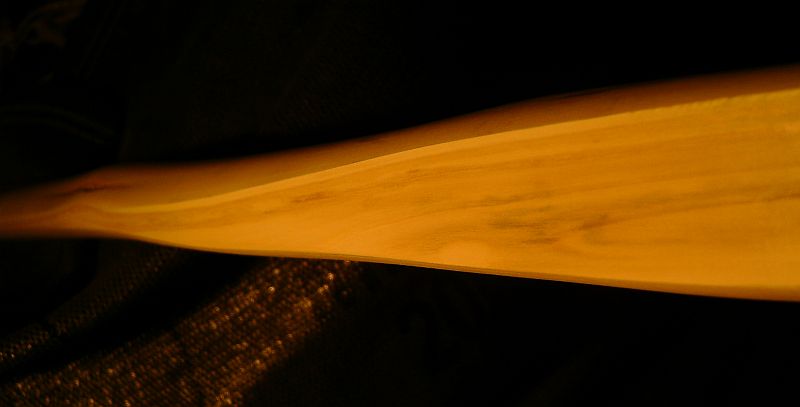 Erst mal hab ich den Bogen auf 1,80m gekürzt und die Mitte angezeichnet. Von der Mitte aus hab ich dann mit dem Hobel und dem Zugmesser den Bauch planiert. Und zwar soweit dass der Griffbereich noch eine Stärke von knapp 4cm hat und diese dann zu den Enden hin gleichmäßig auf 1,5cm runter geht.