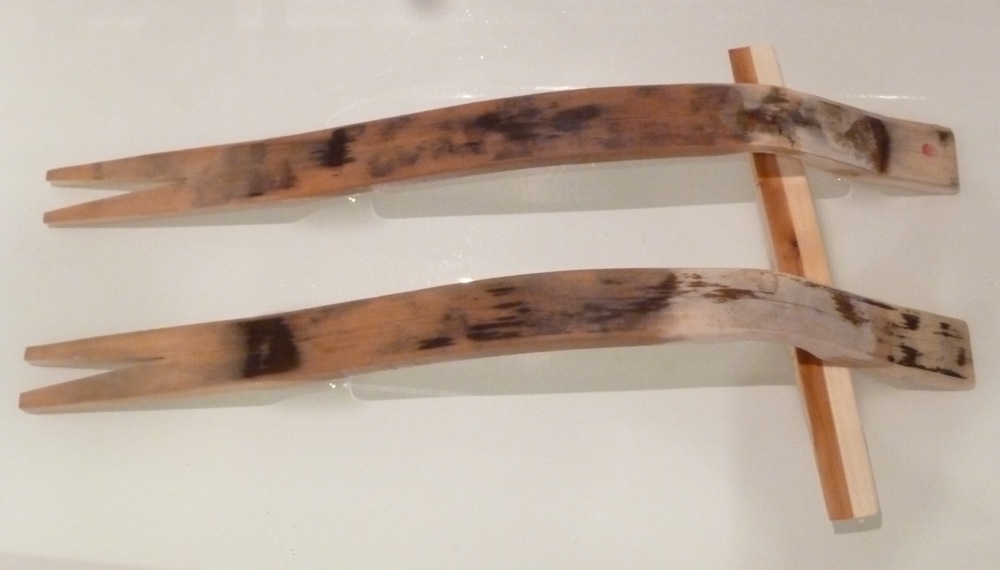 Es wurde alles gedämpft und gebogen, was flach und lattenförmig war und sich nicht wehren konnte, also die Wurfarme von Kern 2 und zwei neue Latten (1x Bergahorn noch aus der Lieferung von Lord Hurny und einmal Spitzahorn). Bei Kern 1 habe ich die zukünftige Klebefläche genau senkrecht zur späteren Biegeachse geschliffen. Das müsst Ihr mir jetzt glauben, Fotos habe ich davon keine.