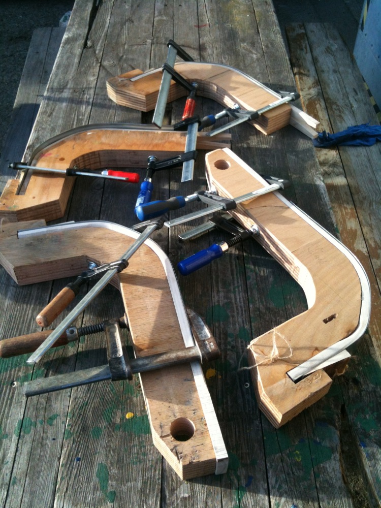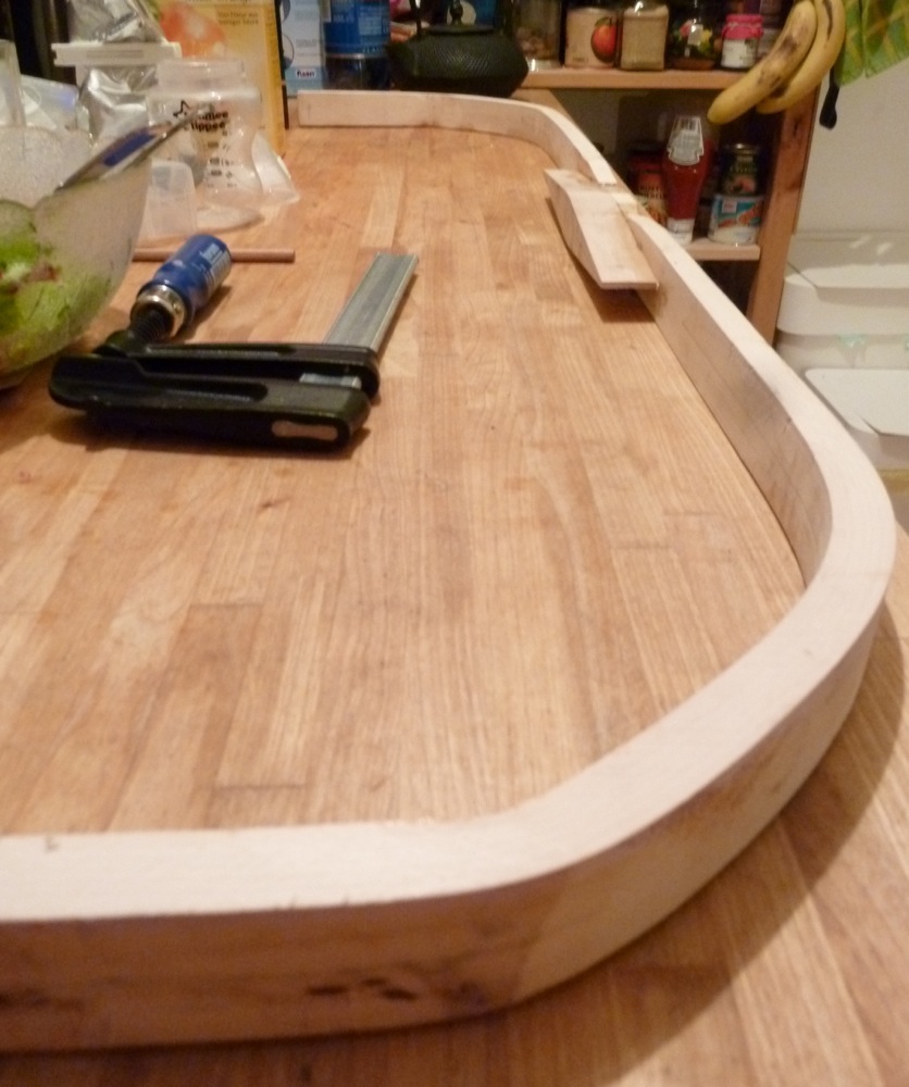 Wichtige Lektion bei diesem ganzen Gemetzel: Beim Biegen sollte die Form nicht hochkant stehen, sondern flach auf der Tischoberfläche fixiert sein. Den Wurfarm kann man dann einlegen, an den Tisch andrücken und dann, immer auf sauberen Kontakt zum Tisch achtend, entlang der Form zwingen. So hat man die Gewähr, dass man sich keine Verwindung reinbiegt.