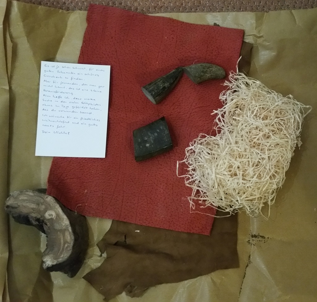 3x Horn, 2x Leder, 1x Wurzelholz, 1x Füllmaterial für die Löcher in meiner Holzwolle-Wand