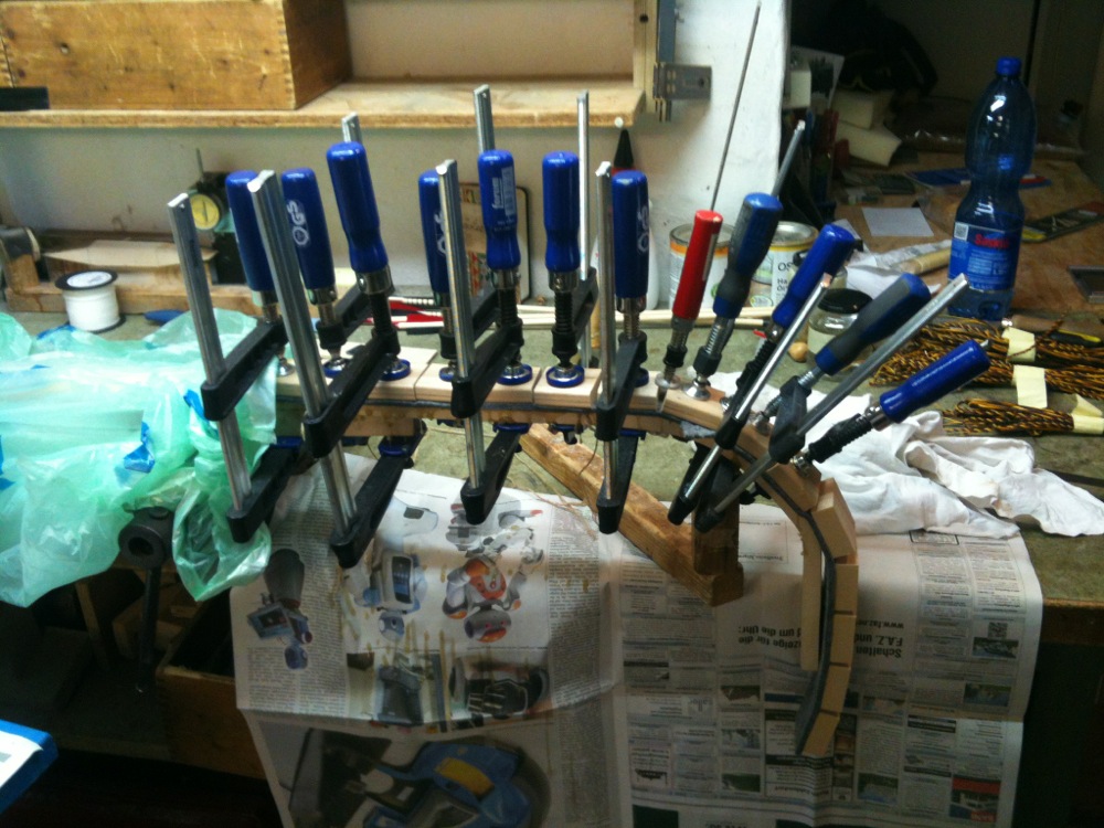 Die Klötzchen-Methode zum Anpressen gefällt mir nicht. An den starken Biegungen liegen die Klötzchen seitlich hohl. Da wäre eine dünne Leiste von 3-4 mm besser, weil die der Biegung folgt und den Druck besser weitergibt.