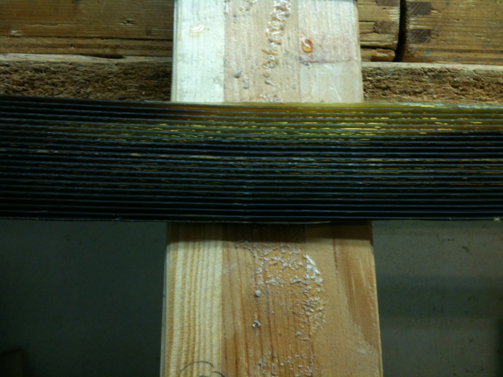 Die Klötzchen-Methode zum Anpressen gefällt mir nicht. An den starken Biegungen liegen die Klötzchen seitlich hohl. Da wäre eine dünne Leiste von 3-4 mm besser, weil die der Biegung folgt und den Druck besser weitergibt.