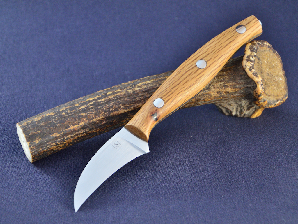 Die junge Frau wohnt auch in meiner Stadt so haben wir uns einmal getroffen und die Details besprochen. Sie wollte ein Messer wie die kleinen Vogelschnabel Küchenmesser von denen ich schon einige gemacht habe. Ausführung mit dem geschwungenen Griff. Als kleine Besonderheit wollte sie eine kleine Perle in den Griff eingelassen haben. Das Holz für die Griff hat sie sich auch gleich mit ausgesucht.