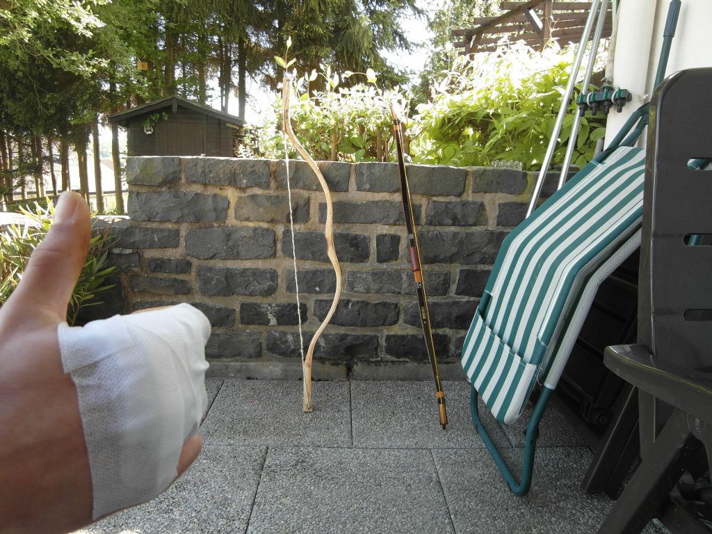 ..und was passiert natürlich, die Sehne rutscht aus der Kerbe, die Armbrust schnappt und drei Finger der linken Hand sind gequetscht zwischen Sehne und Recurve....