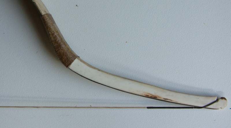 Asymmetrischer Hunnenbogen, unterer Wurfarm-Hebel. Mit Hautleim aufgeklebte Knochenplatten, Wicklung Leinenschnur mit Hautleimbettung