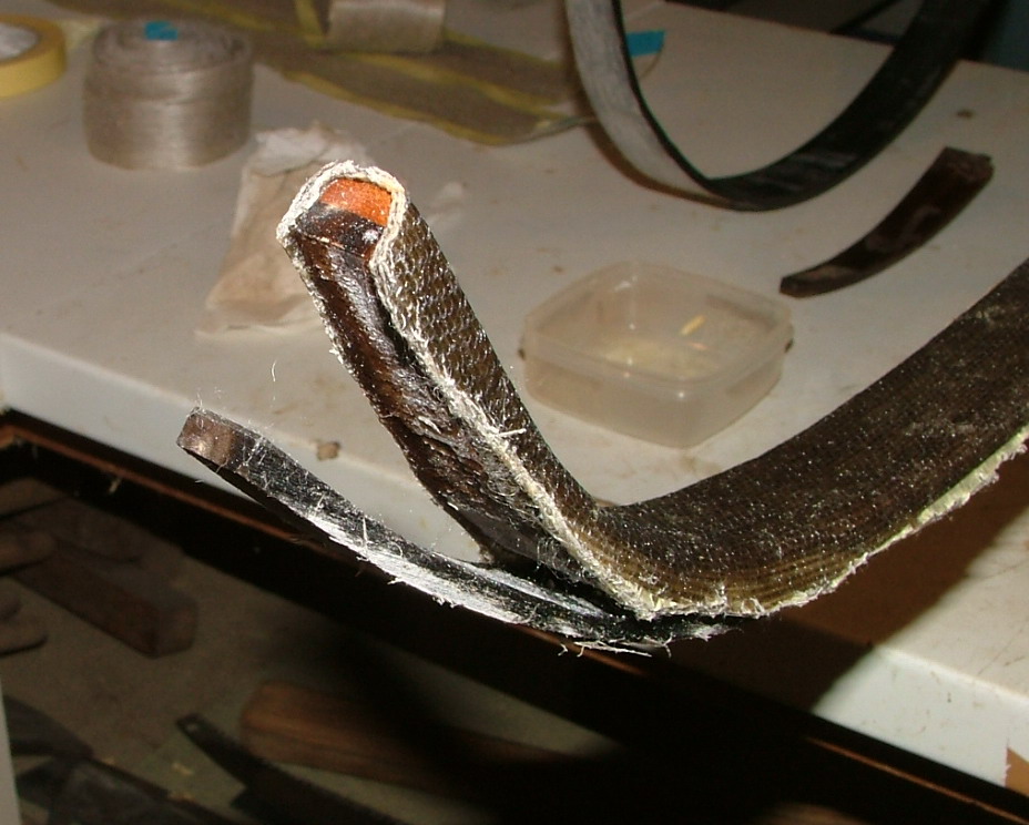 Heute Vormittag hab ich mir den Schaden genau angesehen, zuerst hab ich den Überstand vom Backing mal grob entfernt und dann mit der Feile die Kante des Bogens an einer neuralgischen Stelle des Wurfarms freigelegt, an dem das Horn noch zum Großteil drauf ist.