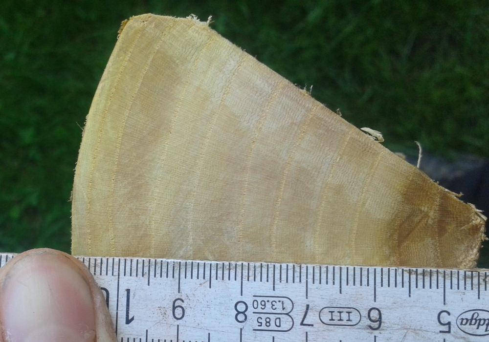 Zum Schälen verwende ich ein stumpfes Messer. Ich fasse am dicken Ende an und Schabe die Rinde in langen Bahnen ab. an Referenzstücken habe ich gemessen, dass die Schäfte dabei etwa einen halben Millimeter Umfang verlieren.