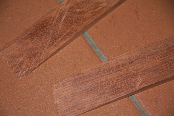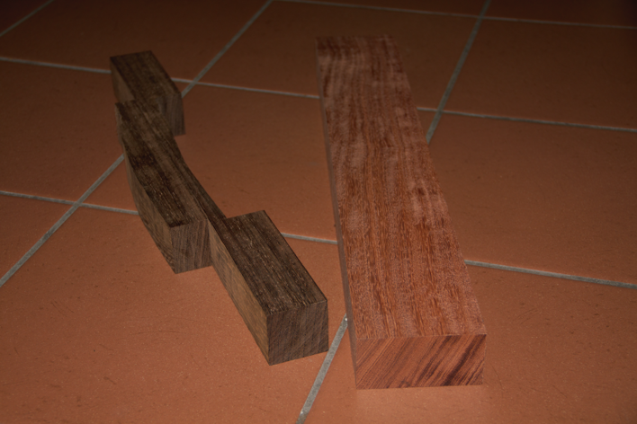 - Links die Zeichnung für das Griffstück und rechts die beiden Hölzer dafür. Ich musste ein Stück von der Wenge absägen und werde es an die andere Seite rankleben, da das Stück sonst zu klein gewesen wäre. Ich werde das Wenge-Stück auf das Bubinga-Stück schrauben (an ungenutzten Stellen), damit ich den benötigten Bogen (auf der Zeichnung zu sehen) in einem Rutsch durchsägen kann.