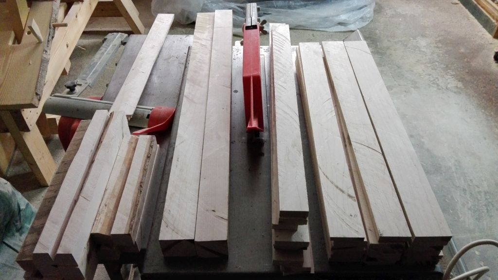 Da ich gestern so gefrustet war , bin ich heute nochmals ins Laubholzsägewerk gefahren. Da habe ich eine 5 Jahre , luftgetrocknete , 2m lange Spitzahornbohle erstanden. Ich musste zwar was hinblättern, aber dafür habe ich eine nahezu astfreie Bohle mit liegenden Ringen bekommen. Daraus konnte ich 14 Rahmen heraus schneiden und 9 Griffe. Nun kann es losgehen