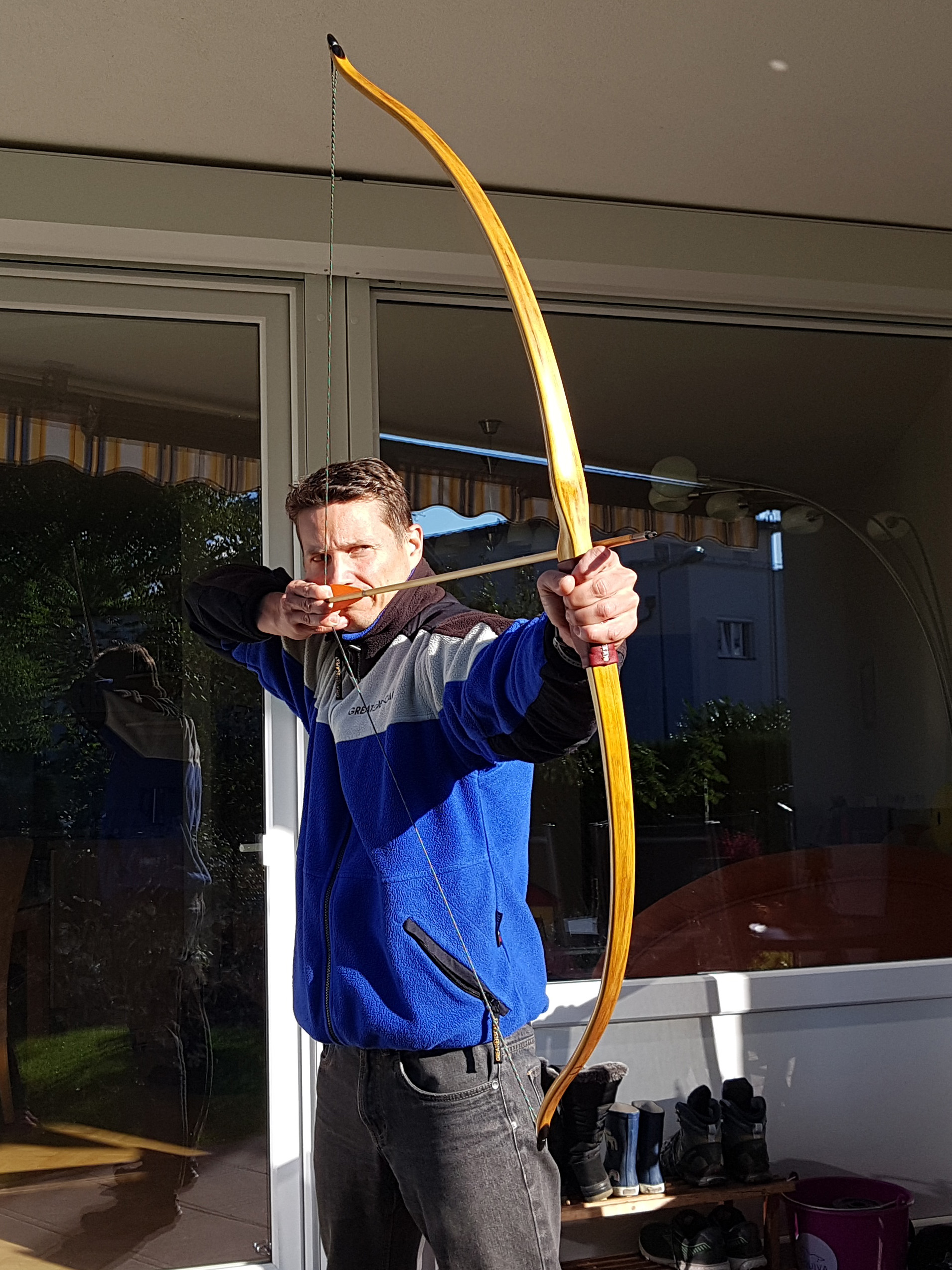 Aktuell hat der Bogen 38lbs bei 28'' Auszug. Masse=387g (ohne Sehne, ohne Griffleder), Länge=59''/150cm (Nocke bis Nocke). Ursprünglich hab ich 30-35lbs Zuggewicht geplant (wobei 38 sich auch gut anfühlt). Für das Feinschleifen oder ev. Korrekturen ist also noch etwas Reserve.