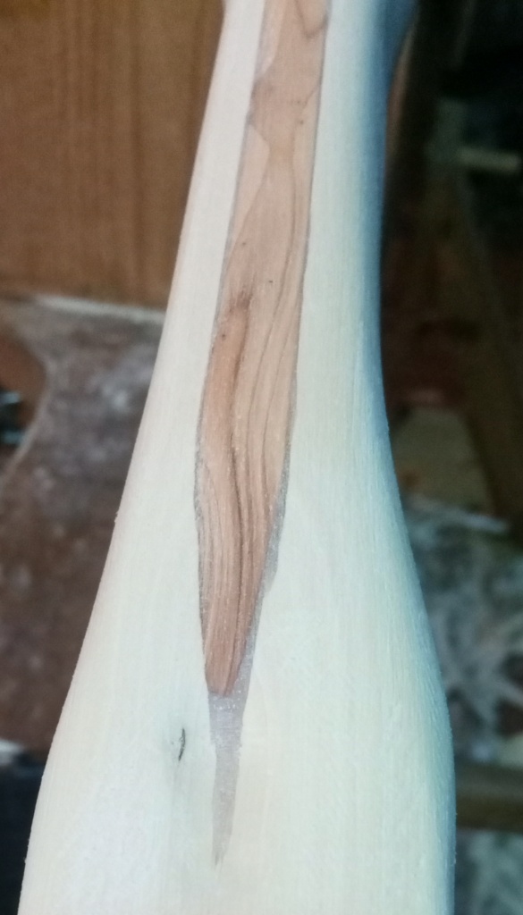 Danach habe ich die Spalten mit neuer Eule verfüllt, dabei auch Sägespäne vom Pfaffenhütchen weiter oben beigegeben, im Versuch, das einheitlicher aussehen zu lassen. Außerdem habe ich die Reste des Markkanals an einem Fadeout ausgekratzt und das ganze Mit Ponal-blau/Sägespäne verfüllt, so als Holzspachtel, mal ein Versuch.