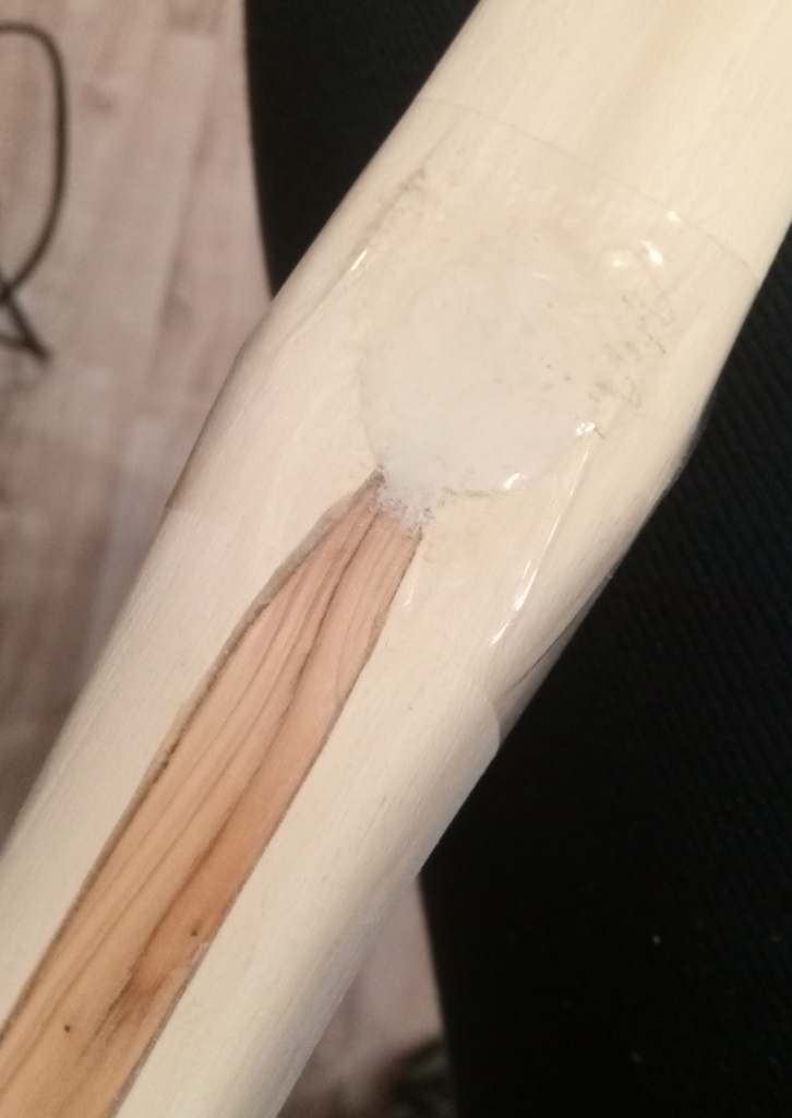 Damit das Epoxid der Tipoverlays besser härtet, habe ich den Bogen drinnen gelagert, auf der Heizung im Schlafzimmer. Da ist es warm aber nicht zu warm. Am nächsten morgen hatte der Keil seitlich Risse (dachte erst, die Eibe wäre noch zu feucht gewesen) aber auch der Bauch! Also war das Pfaffenhütchen nicht wirklich trocken. Die bauchseitigen Risse (Längsrisse) verschwanden später wieder.