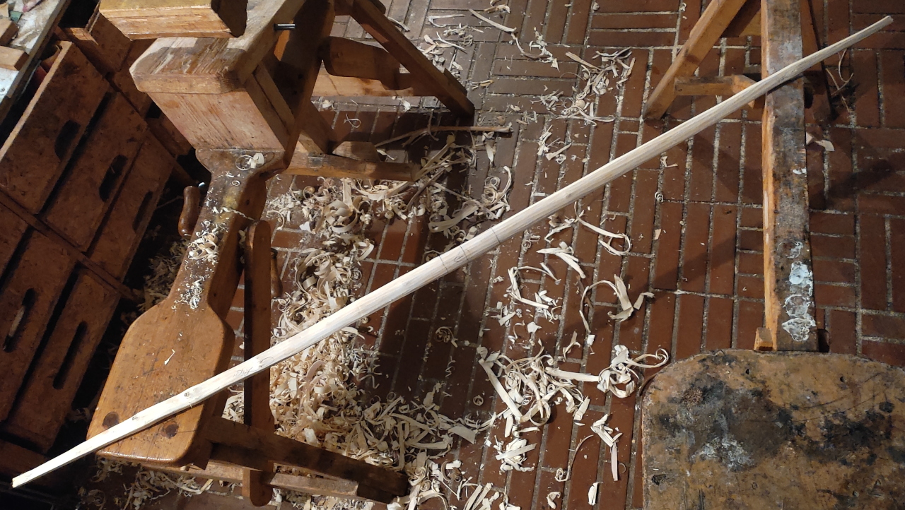 Tja, die Kirschpflaume ist auch seitlich schief, hat einen stärkeren reflexen Knick, zu mühsam. Also nehmen wir das Pfaffenhütchen mal ran. Länge nur 162cm. So nach Augenmaß Breite/Dicke machen: Dummerweise ist es in sich verdreht, d.h. Sehne seitlich aus der Spur. Würde man den Bogen im Stave drehen, ginge es mit der Sehne. Das Ende des einen Wurfarms war ja sowieso in sich gedreht. Nachdem Biegekorrekturen bei Pfaffenhütchen schwierig sind, dachte ich mir, probiere ich das Drehen. Dadurch wird die Breite immer weniger (28mm am Griff) und die Höhe wohl auch, der hatte zwischendrin aber noch erstaunlich viel Stärke.