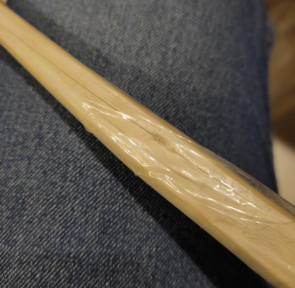 Ja, wäre wahrscheinlich besser, links hatte ich mir so etwas schon markiert. Heute dann alles Mal glatt geschliffen, Kanten nochmal gerundet. Dann Hornplatte abgeschnitten und diagonal in zwei Stücke gesägt, gibt sehr kleine Overlays. Dann einmal Uhu endfest angerührt und Risse behandelt (mit normalem Fön flüssiger gemacht), final abgewischt und mit Klebeband gegen Auslaufen gesichert. Habe nur jeweils ein Bild. Ein Riß war viel länger als noch vor ein paar Tagen, geht diagonal über den Wurfarm über eine ziemlich lange Strecke. Ich habe meine Zweifel, ob da überhaupt genügend Kleber reingekommen ist und ob das überhaupt hält. Wäre sehr schade, wenn nicht. Habe dann den restlichen Uhu auf die bröseligen Äste an Rücken und Bauch gemacht.