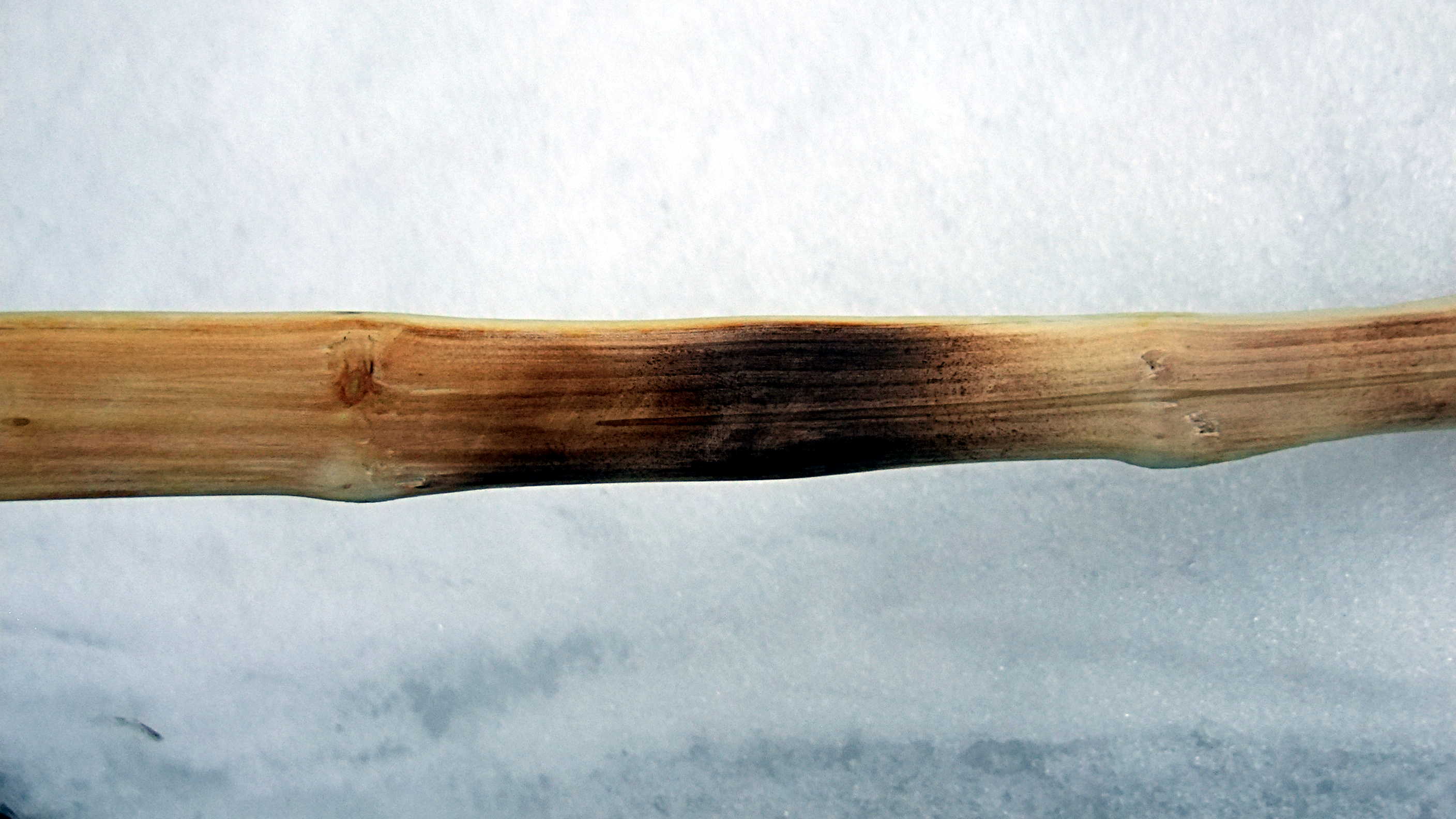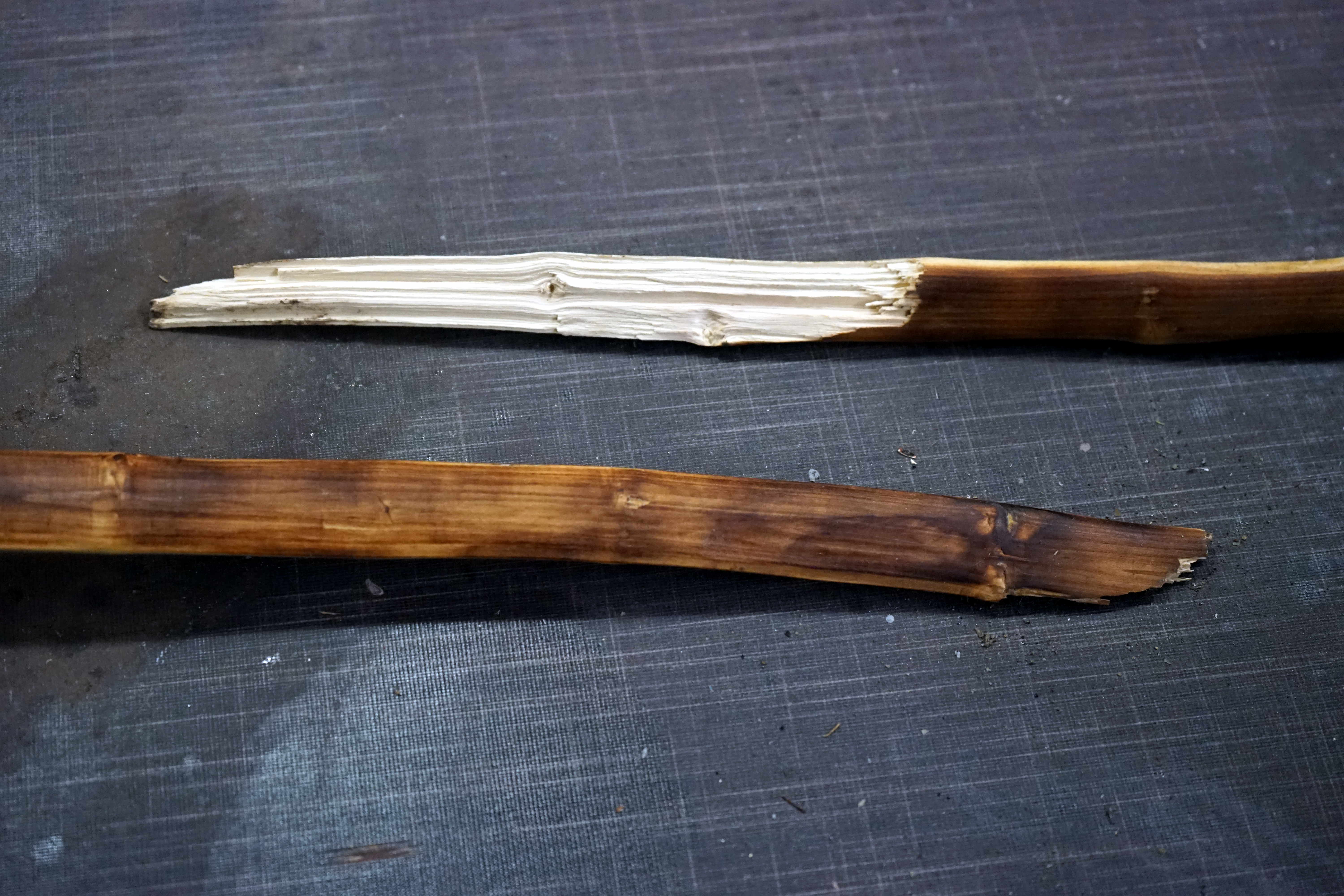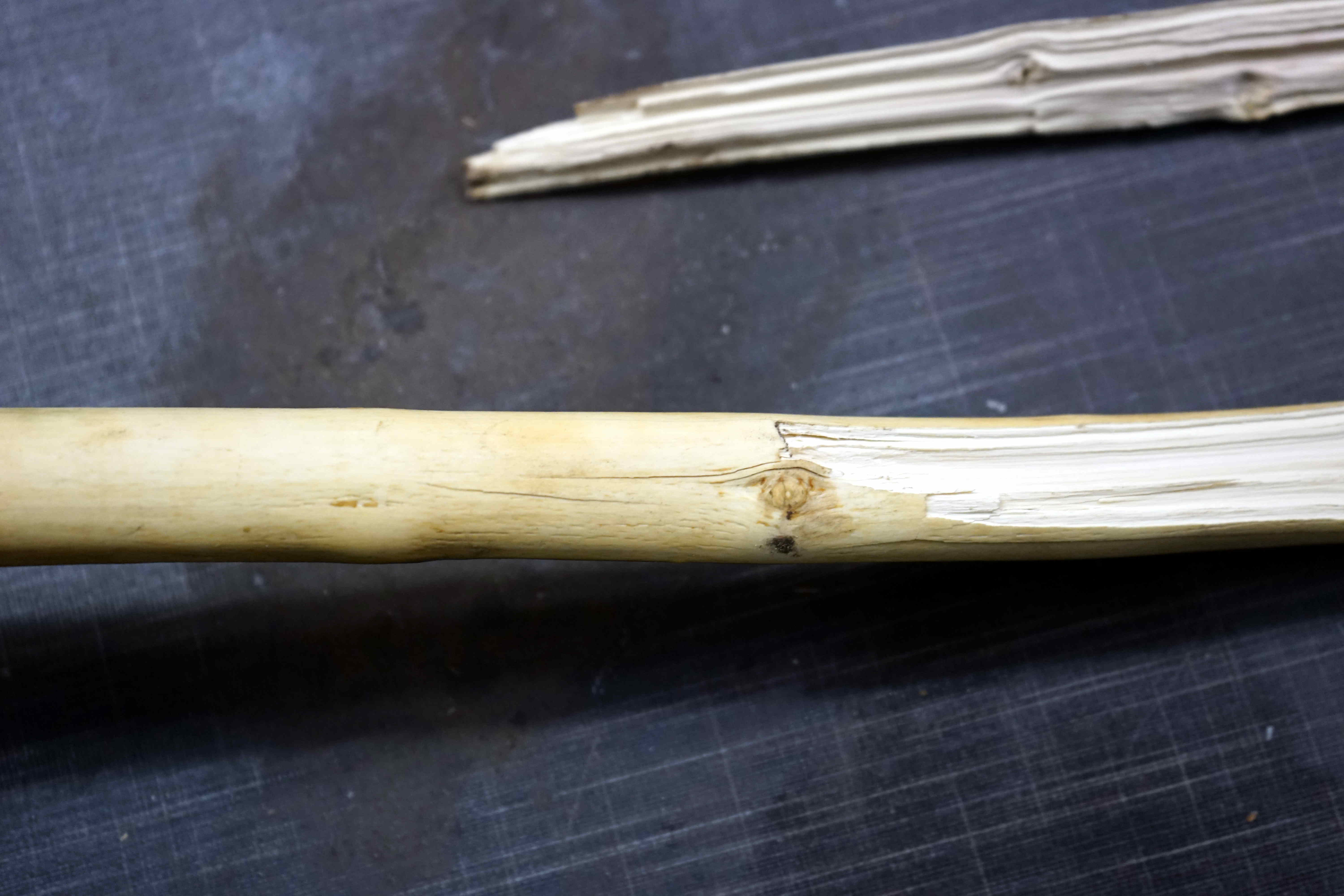 Der Liguster ist gebrochen, beim Probeschießen, beim zweiten mal Ausziehen, über den Rücken. Sehr lehrreich ist das jetzt nicht, kann viele Ursachen haben, zu dünner Rückenring (< 1 mm), zu doll getoastet, Tillerfehler (dort an dem Ast sollte gar keine Biegung sein), zu große Ambitionen bzg. Auszugslänge (viele Äste).