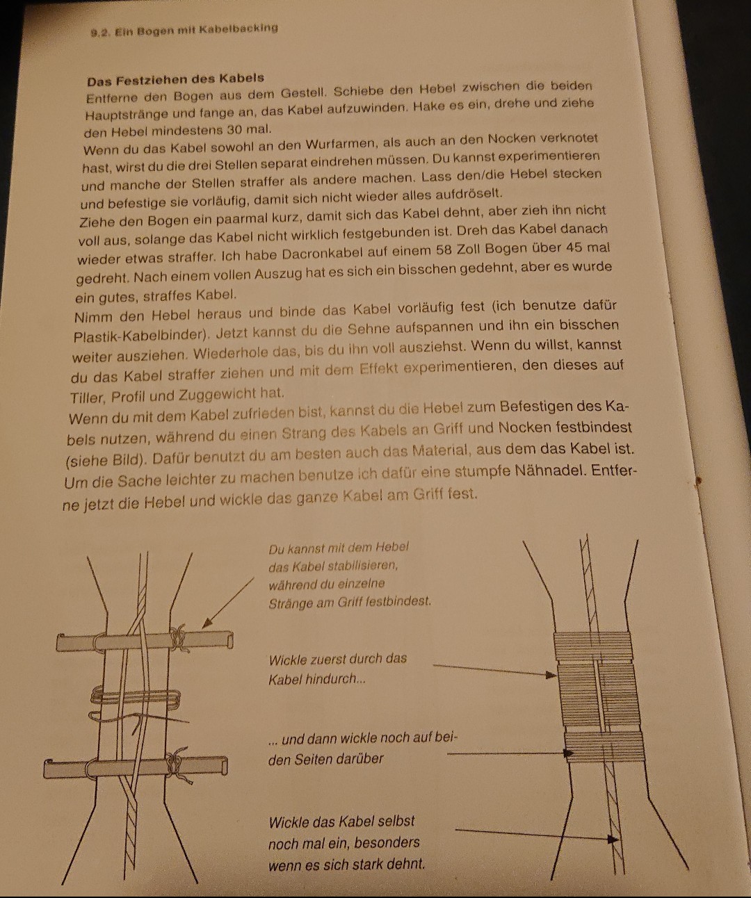 Das Kabel hat es beim Aufspannversuch durchgeknackt, ich brauche besseres Kabelgarn. Was zu sehen war, war, dass die Hauptbiegung mit Kabel zu sehr in der Mitte lag und die Wufarme zu steif waren. Ich könnte ein Kabel pro Wurfarm nehmen und die in der Mitte doppelt laufen lassen, dann könnte man auch die Spannung für die Wurfarme separat regulieren. Dann müsste ich allerdings irgendwie nahe bei der Mitte zwei Punkte zum Knabelanknoten schaffen. Oder ich klebe, ich lebe ja in Mitteleuropa, hier funktionieren Klebstoffe. Oder ich pappse doch mit Sehnen rum (muss man ja mal anfangen).