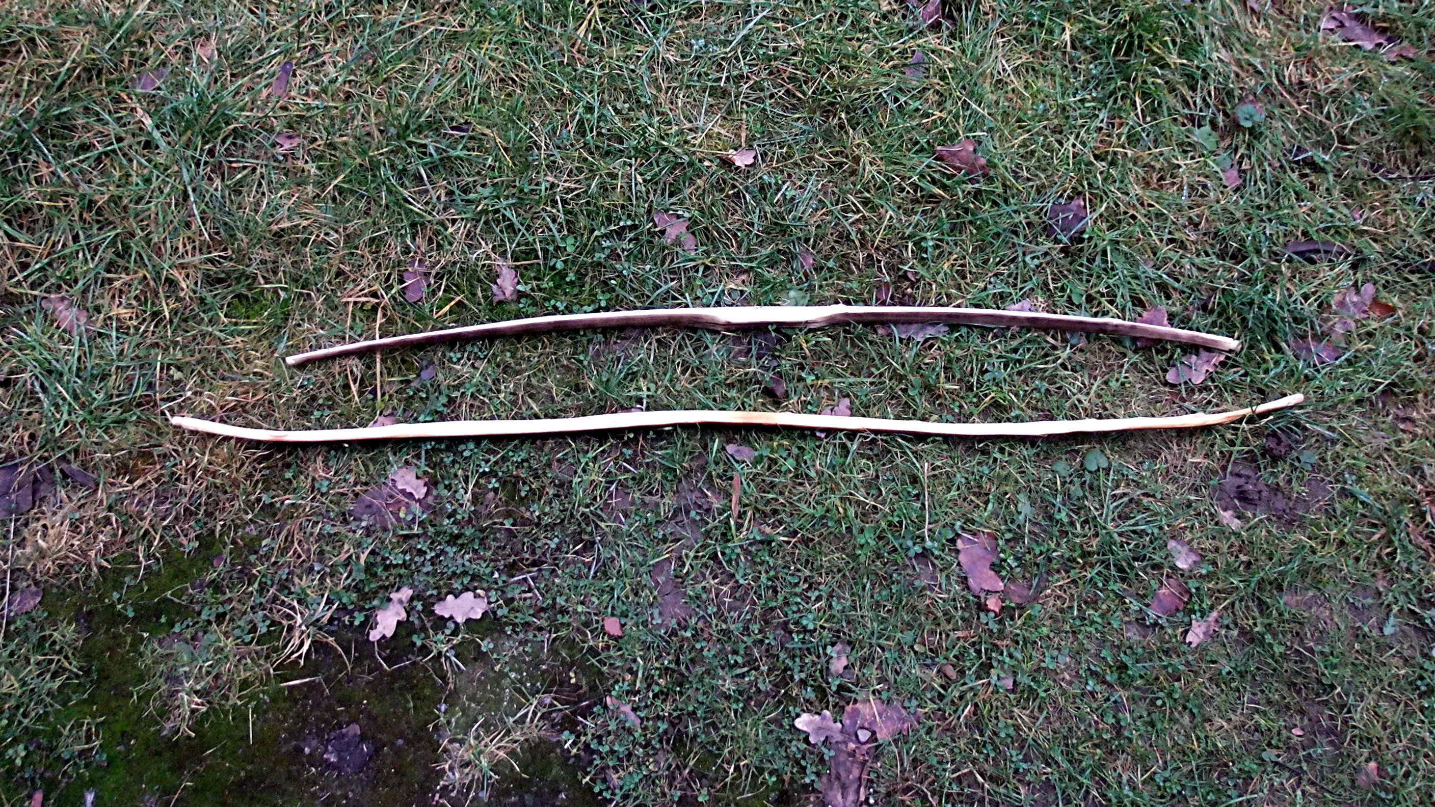Der Ahorn hat mich gestern nachmittag beschäftigt, das Standhöhenfoto zeigt das erste mal Standhöhe, links deutlich zu steif (das ist nicht mein Tillerstock, ich tillere frei Hand, dort liegen Bogen nur für Fotos) und insgesamt noch zu stark. Ein vorsichtiges Zupfen mit der Zugwage zeigte auf Standhöhe 38 lb, das hält Ahorn bei nur 143 cm Länge und akzeptablen Auszug wohl eher nicht aus. Ich hatte noch keinen Ahorn, bin deswegen vorsichtig.