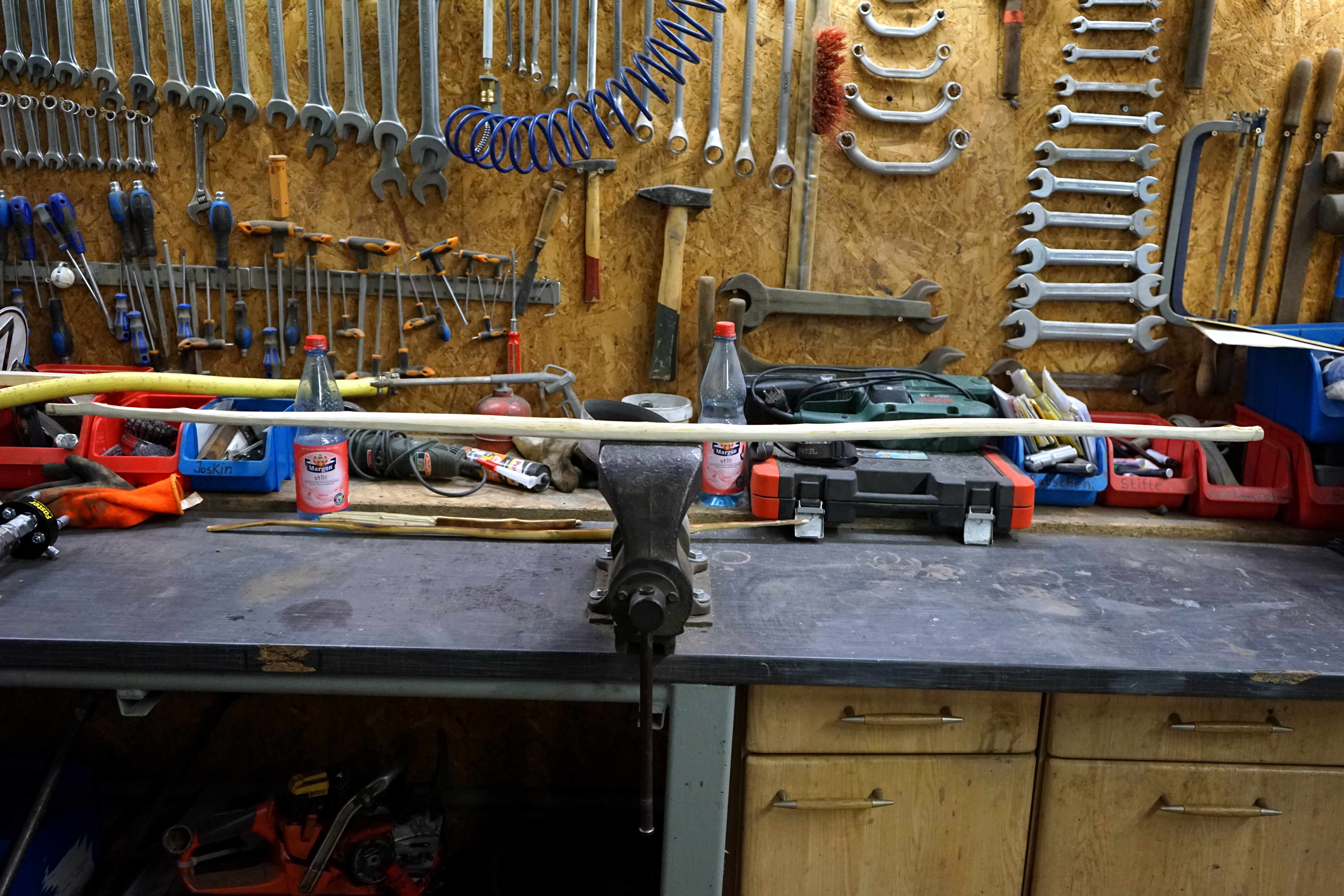 Aus dem Tatarenhartriegelrest habe ich einen Kinderbogen gebaut. Ohne Tempern zog er sich ein wenig Schaumgummi, mit Tempern ist er unauffällig. Hat ein bisschen Drehwuchs. Kräftige Neigung zum Set.