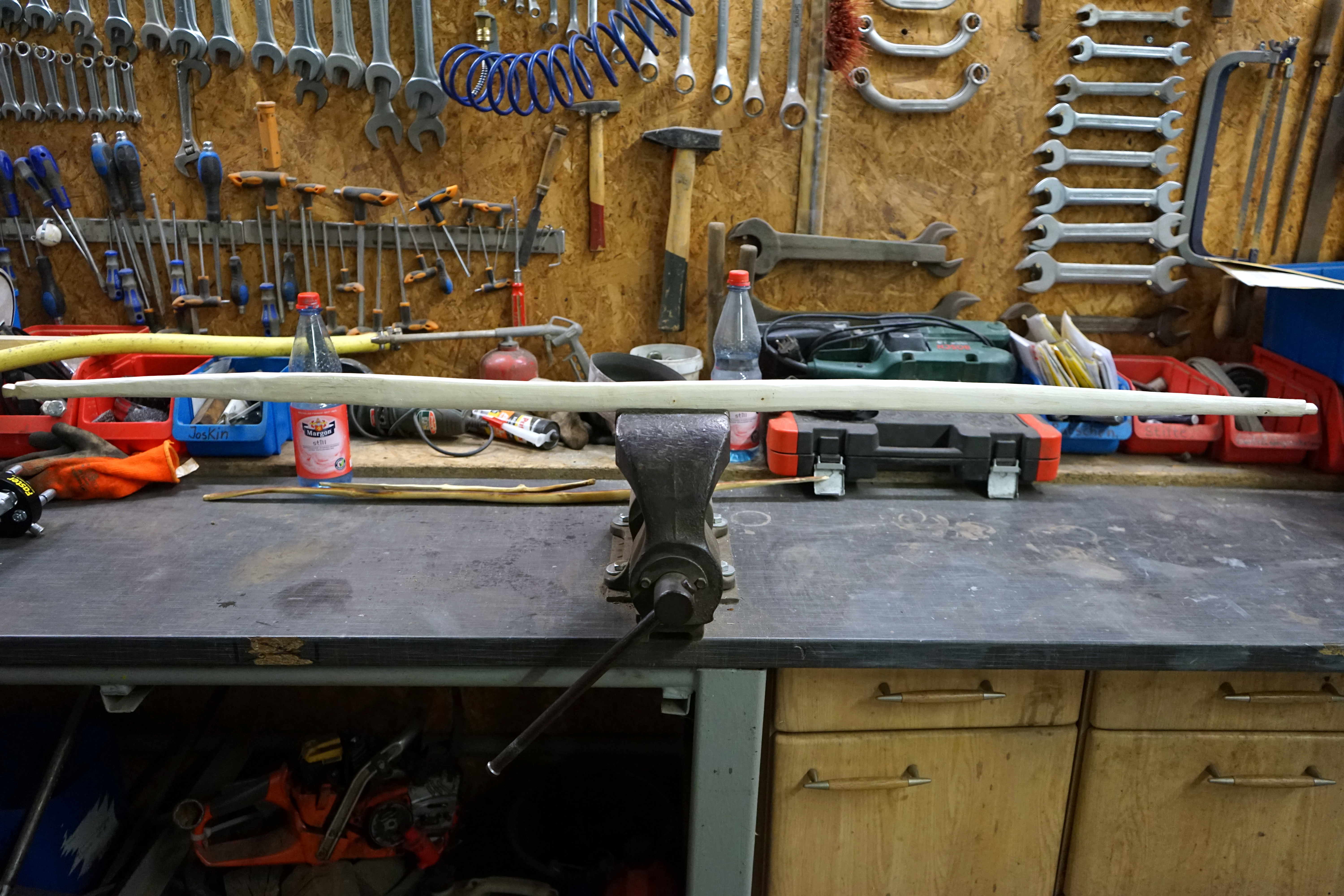 Ich habe es noch mal zur Hand genommen, ansatzweise getapert und dabei eine Schwachstelle an einem Querast produziert und einen Spanausriss im Griffbereich, ruppig weitergetrocknet, übers Knie getillert, dann mit Tillerschnur in der Hand, und getempert (die Schwachstelle intensiver). Morgen früh tillere ich nochmal, kratze sicherlich noch etwas um die Schwachstelle rum weg und dann werde ich mal sehen was er bringt. Wird so sehr knapp werden.
