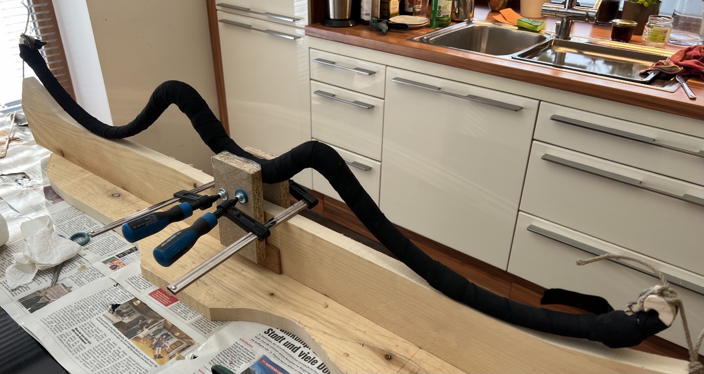 Heute mit dem Seitentaper und Dickentaper begonnen. Habe mich für ein rundes Querschnittsprofil im Griffbereich, für ein dreieckiges im Wurfarmbereich und für ein querovales Querschnittsprofil im Bereich der Wurfarmenden entschieden. Von 600g ist der Bogen auf knapp unter 400 Gramm erschlankt. Morgen dann die Gestaltung der Tips und weiter Verschleifen.lG Stephan