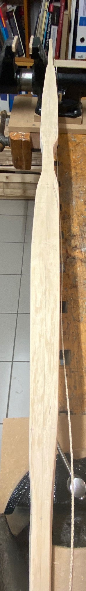 Das kommt mal so ganz grob geschaetzt hin. Es langt also nicht, wenn man den Bogen nur duenner macht, wenn er bei 40# rauskommen soll. Der muss auch schmaeler werden, sonst wird das ein fettes Paddel, das wirft wie die bekannte nasse Nudel.