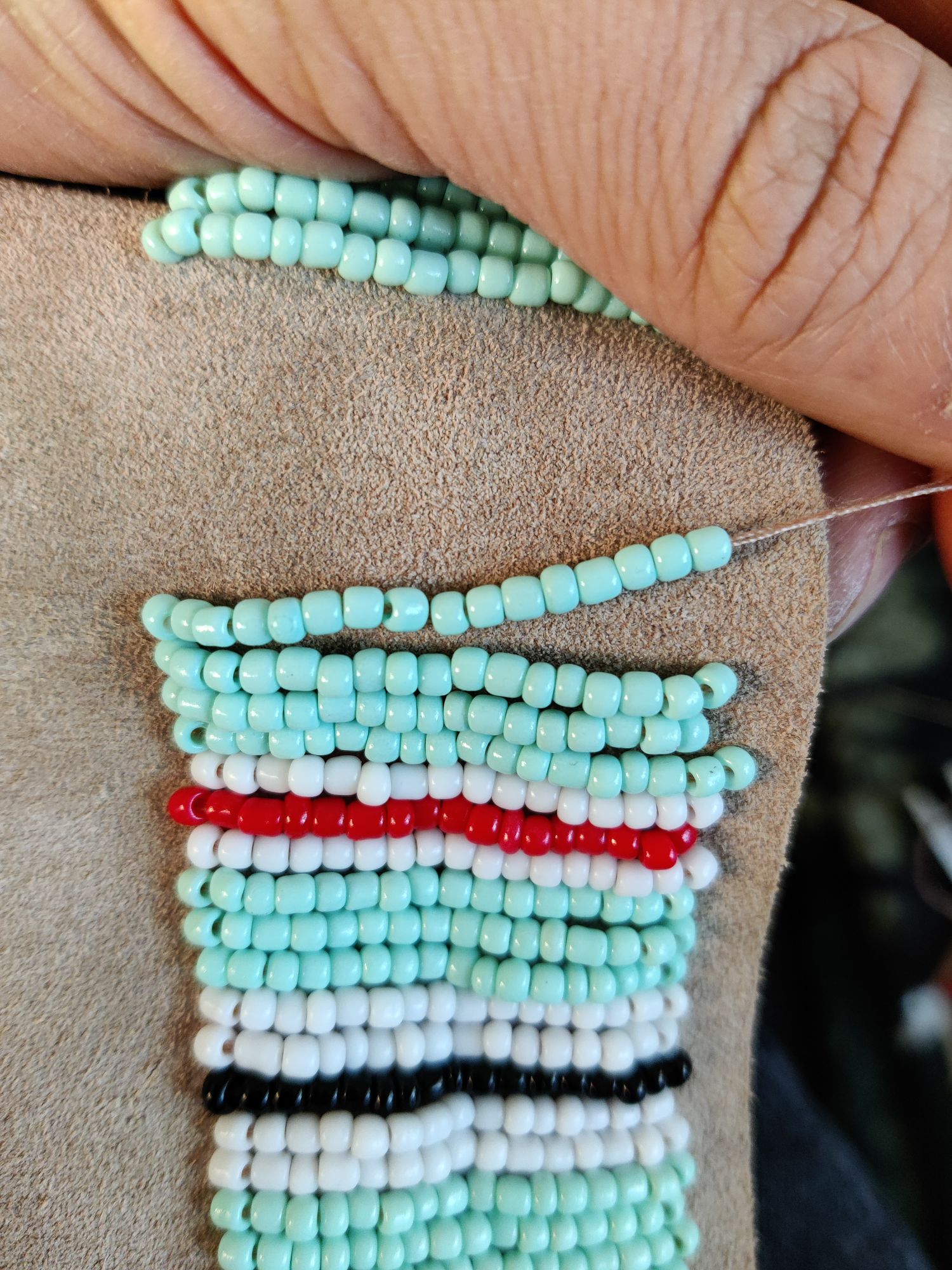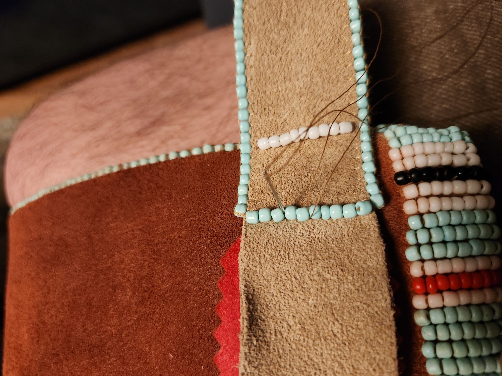 Der Köcher färbt jetzt nicht mehr ab und ich hab begonnen die Riemchen am Köcher zu befestigen. Zuerst mit Kleber auf Position fixiert, dann hab ich die weiße Perlenreihe befestigt, aber gleich alle am Stück ohne zwischenstiche. Wäre mir zu schwierig da beim durchstechen die richtige Position zu treffen. Deshalb hab ich dann für besseren halt unter der blauen Perlenreihe hin und her gestochen. Somit sieht man die Naht nicht.