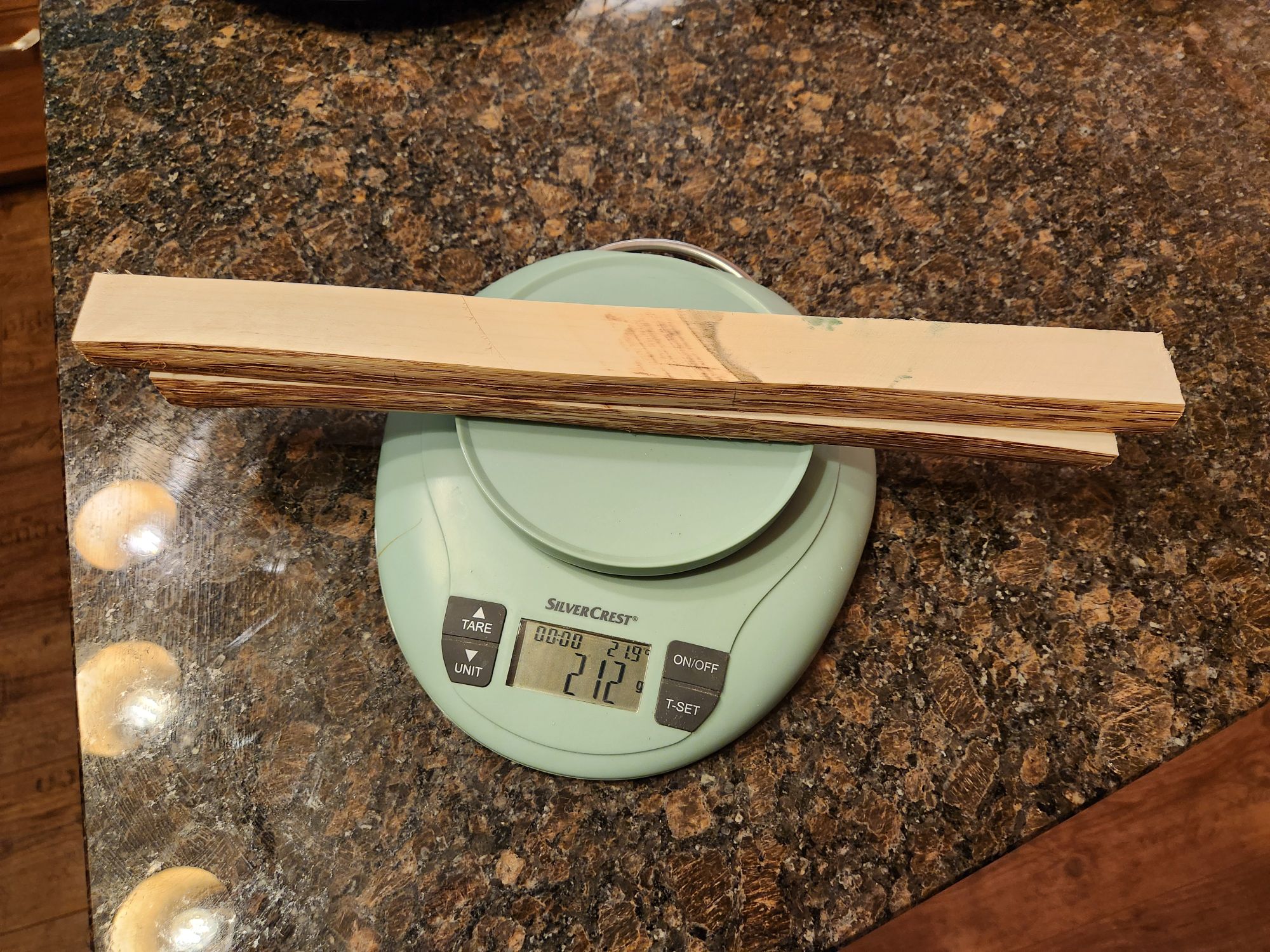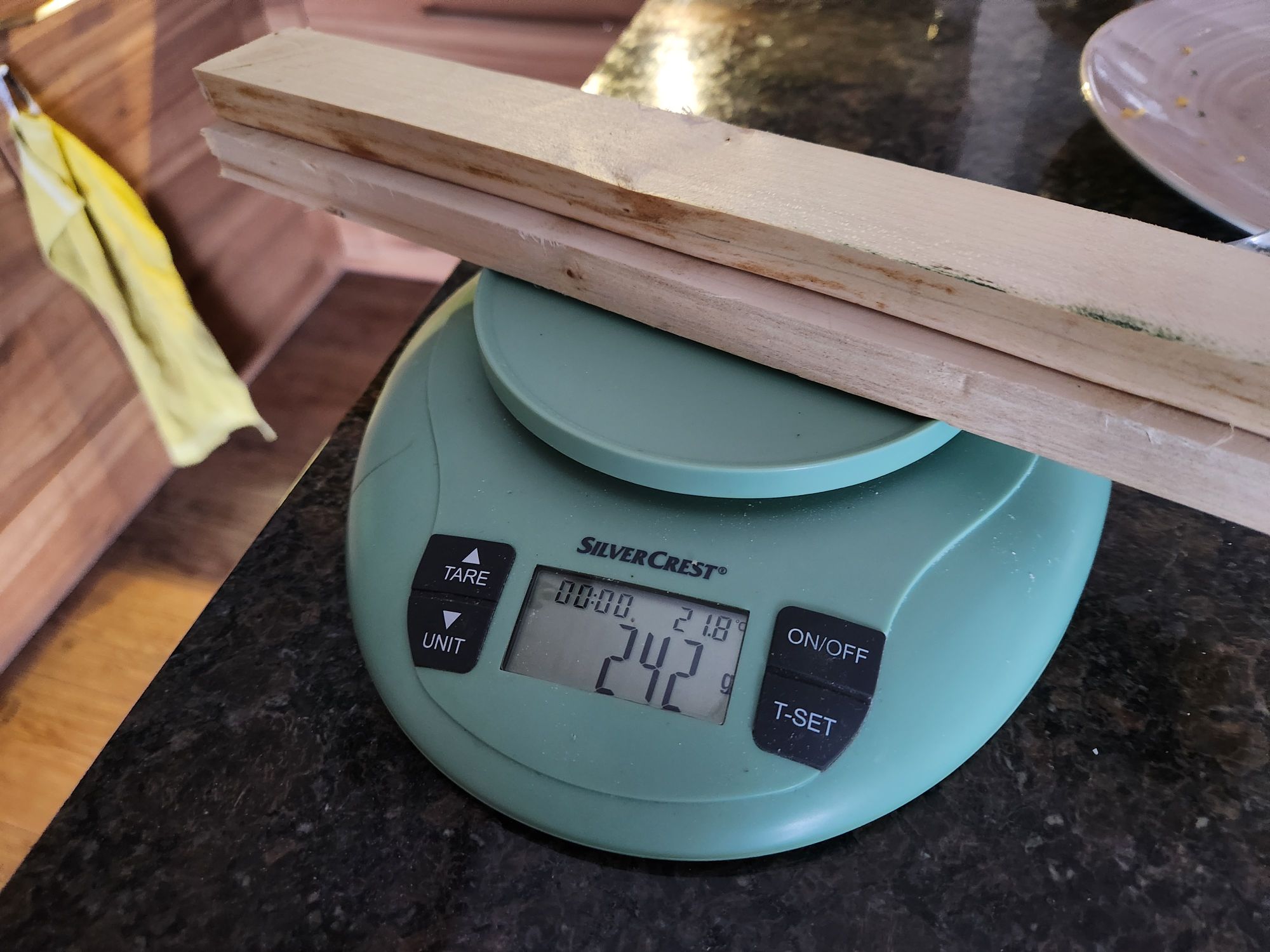 Die Hasel Recurves wiegen 99g und die Ahorn 85g. Ich hab dann die dicke der Recurvepaare gemessen. Die Haselleisten sind zusammen noch 32mm dick und die Ahornleisten 29mm. Aber wenn man das auf die gleiche Dicke rechnet sind die Ahornleisten trotzdem noch etwas leichter, also werd ich die nehmen.