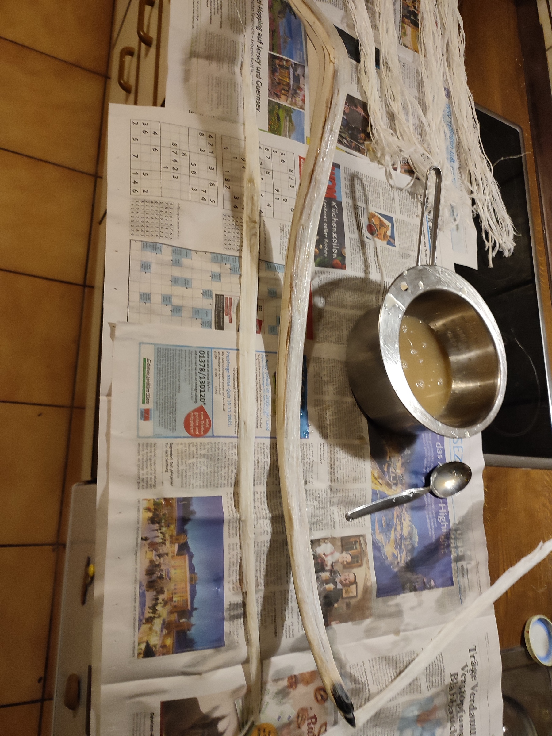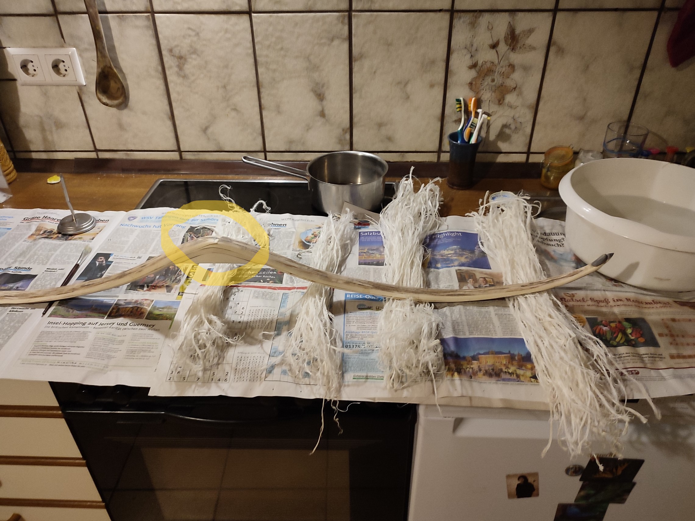 So heute kamen die Sehnen drauf. Der Bogen wurde mit einem 10%tigem Hautleim grundiert und mit 25%tigem Hautleim mit Sehnen belegt. Die Straußensehen wurden gewässert und waren so lang, dass sie vom Griff bis zu den Tips reichten