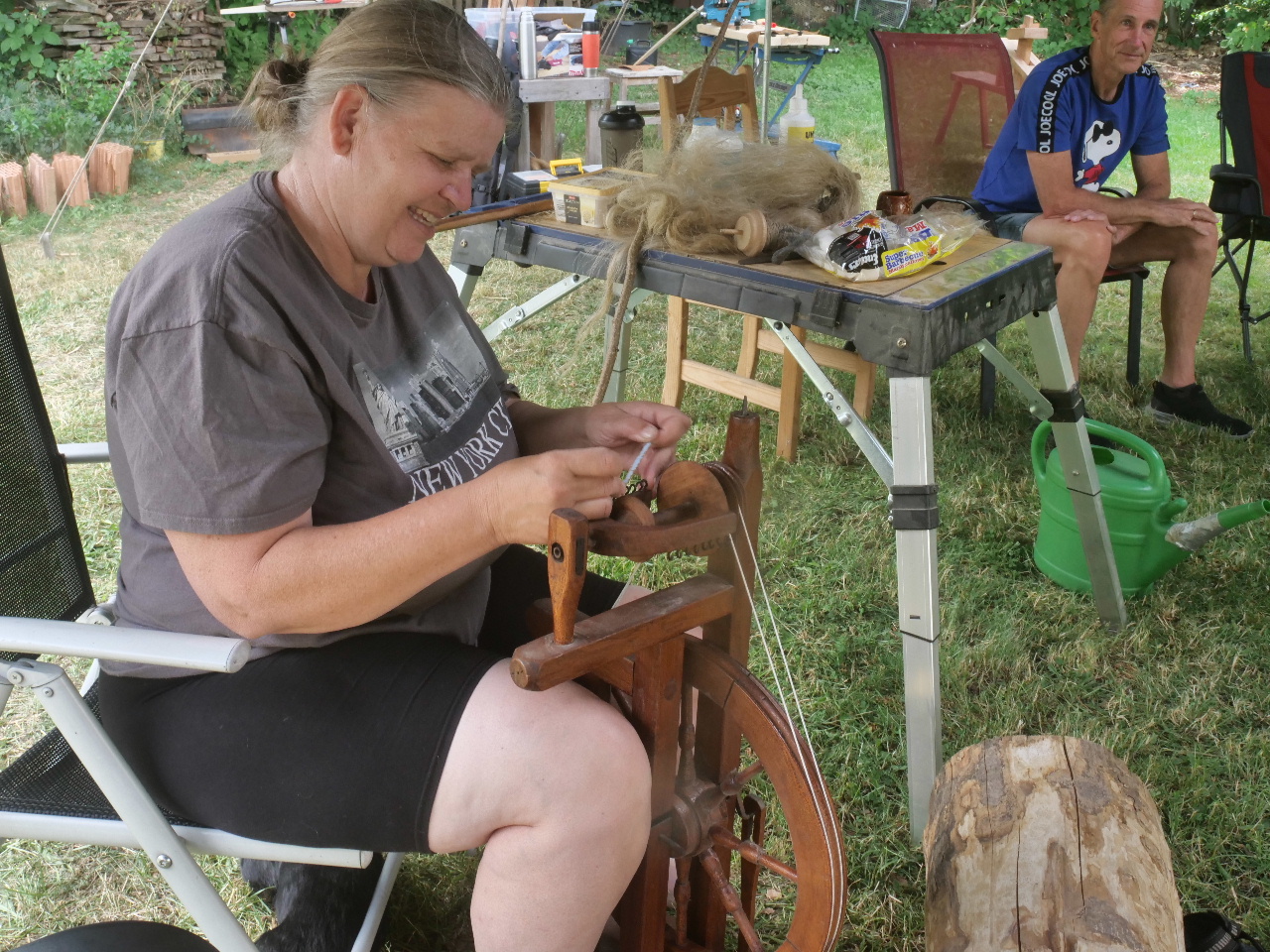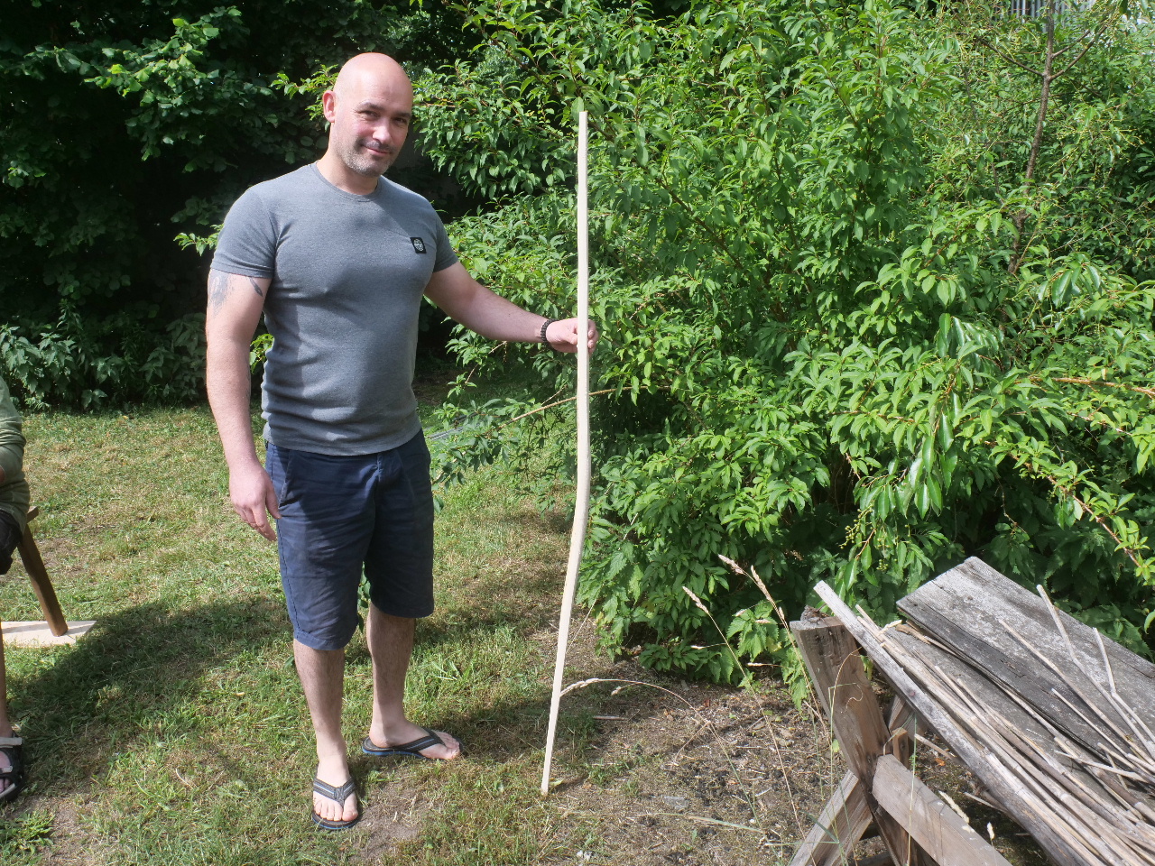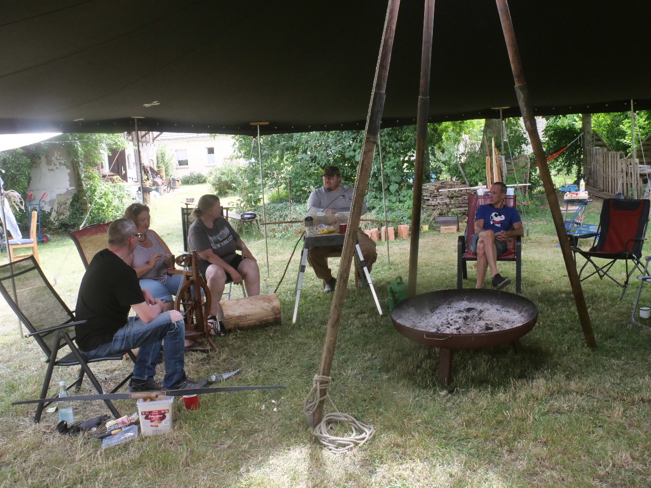Wer es noch nicht kennt: Kai und Judith veranstalten diesen Bogenbauer-Treff schon eine ganze Reihe von Jahren, einmal jährlich. Er findet auf ihrem großen Resthof statt, diesmal mit dem großen Zeltdach einer Jurte gegen Sonne und Regen. Hier wurde dann an verschiedenen Bögen aus Hartriegel, Esche, Eibe, Ilex, Elsbeere, Glasfaser, Manau und Robinie geschnitzt. Die Damen beschäftigten sich derweil mit dem Spinnen von Wolle mit der Handspindel oder einem neu aktiviertem Spinnrad.