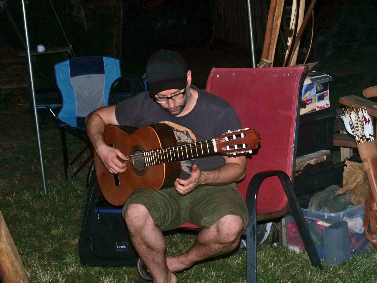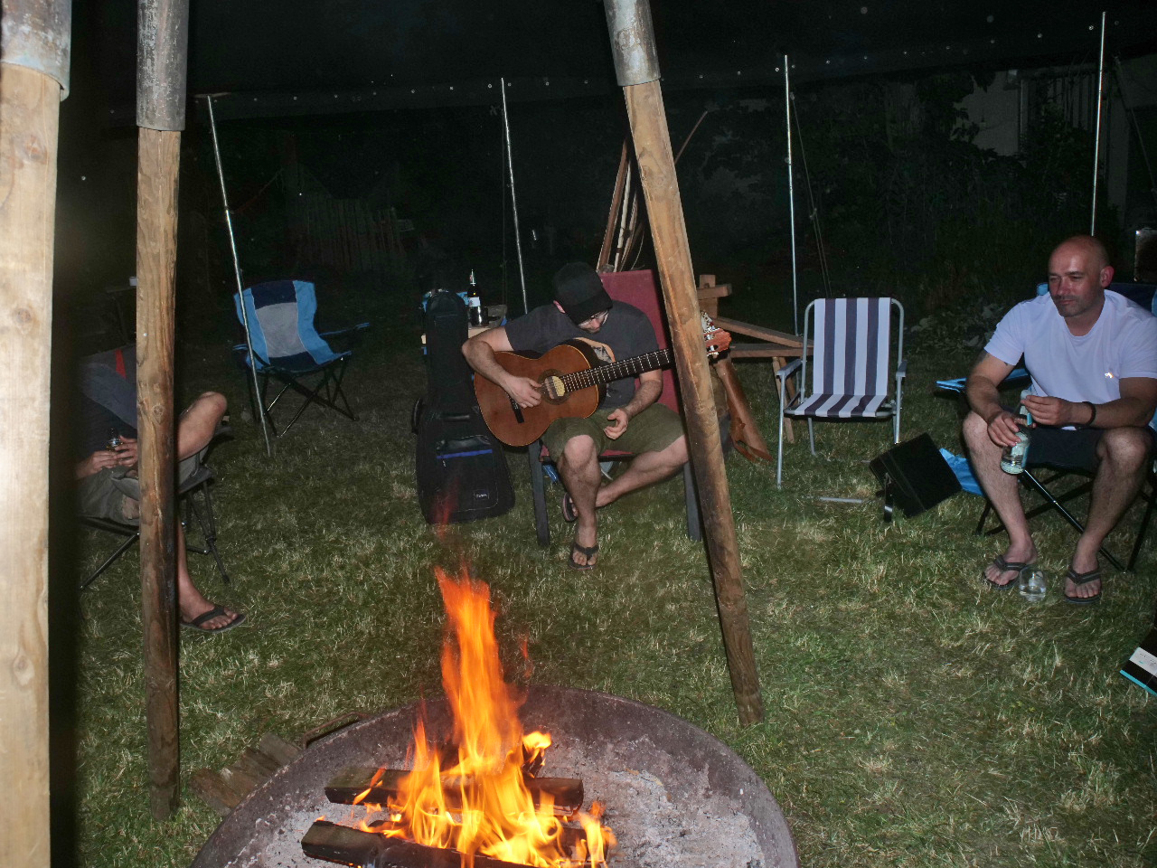 Dann ging es mit dem gemütlichen Teil weiter: Botjer kümmerte sich um die Feuerschale und Eduard holte seine Gitarre hervor. Wie schon vor drei Jahren spielte er virtuos klassische Konzertgitarre und immer noch muss ich sagen: Ich habe am Lagerfeuer nie einen besseren Gitarristen erlebt. Aber diesmal….