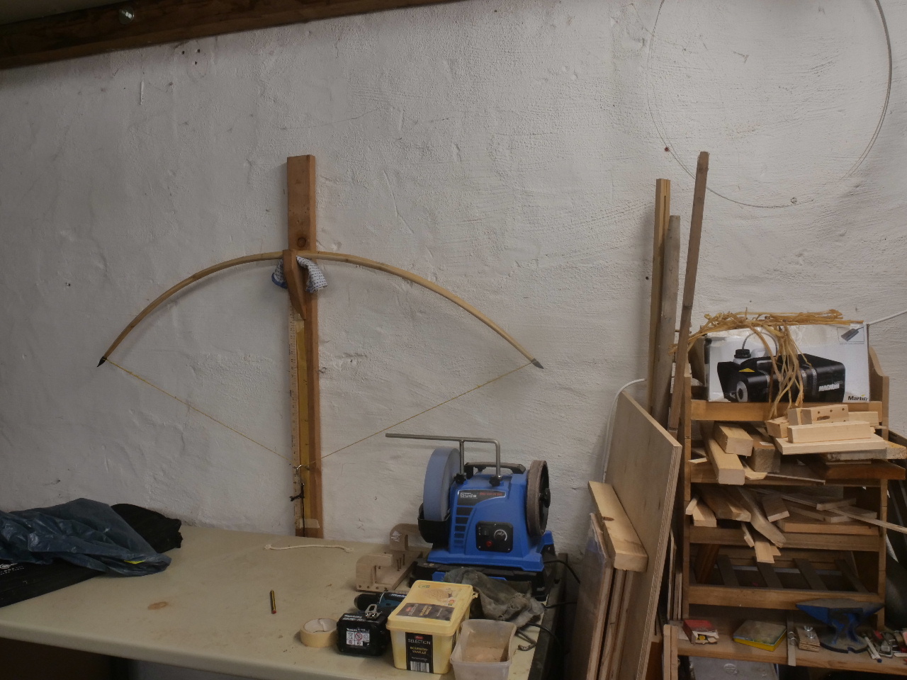 Für mich ein neues Bogenholz: Ilex. Daher erstmal vorsichtig gebaut: breit und lang (55 mm, 178 cm), dazu pyramidale Wurfarme. Ich habe ausschließlich mit Raspel, Schweifhobel und Bowyer´s edge gearbeitet und kam bis zum Aufspannen der Sehne auf Standhöhe. Ich werde berichten, wenn das Teil fertig ist.