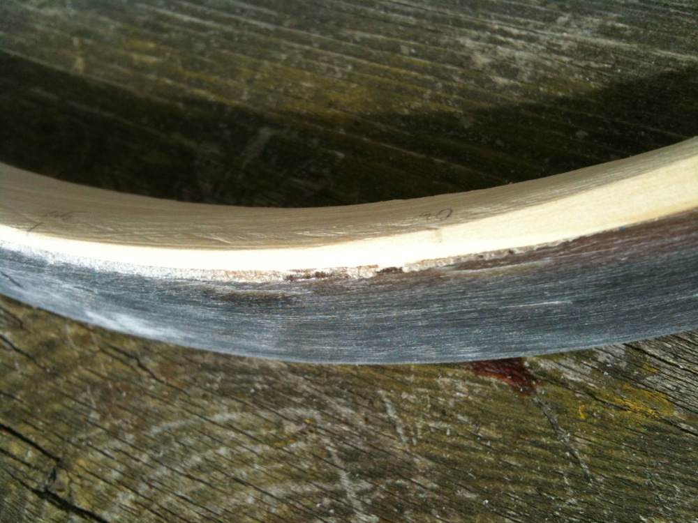 Mein Fazit daraus: Die Gesamtdicke im biegenden Bereich könnte wichtiger sein als das Verhältnis der einzelnen Schichten zueinander. Ich wollte ursprünglich 1/3 - 1/3 - 1/3 bauen, aber das gaben die Hornstreifen nicht her. Jetzt ist das Holz dicker, als ursprünglich geplant. Ich hoffe, das wird nicht viel ausmachen, solange die Gesamtdicke gleich bleibt.