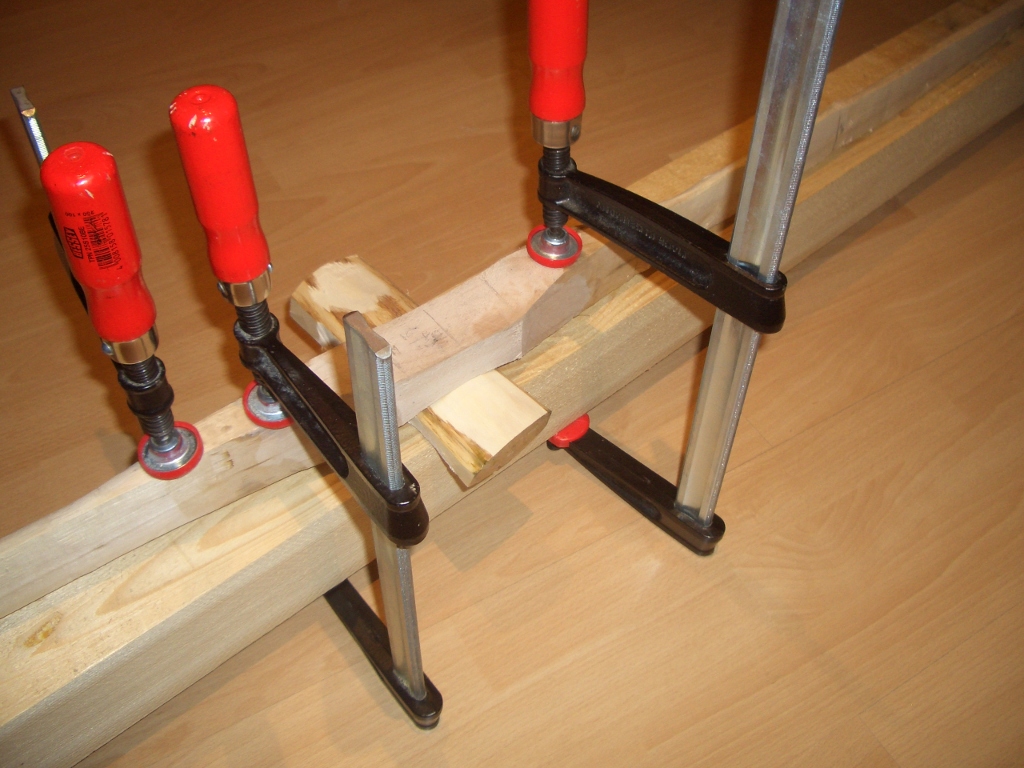 Damit die Biegung wirklich nur im Griff stattfindet und um die Stelle mit den Längsrissen zu entlasten, hab ich dann nochmal griffnah mit Zwingen nachgeholfen.