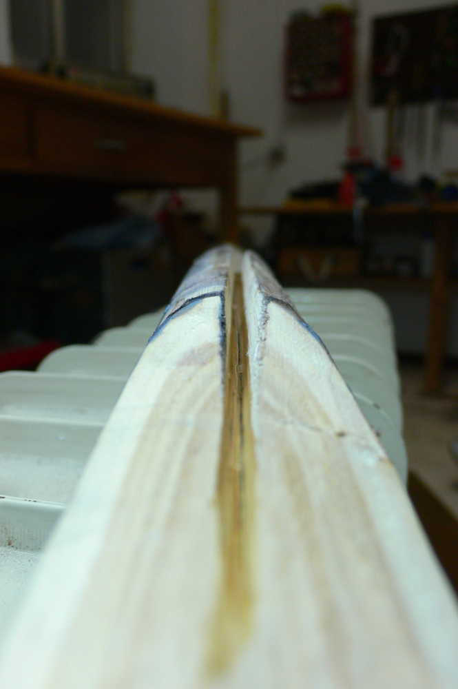 Nach dem runterarbeiten der WA bis auf/unter den Markkanal hat der Stave erstmal eine Nacht unterm Bett verbracht, bis ich dachte den könnte ich doch wegen des Knicks auf ne Latte aufspannen. Gesagt, getan (leider hab ich diesen Schritt nicht fotografiert) so hat der jetzt gut 3,5 Wochen gelegen.