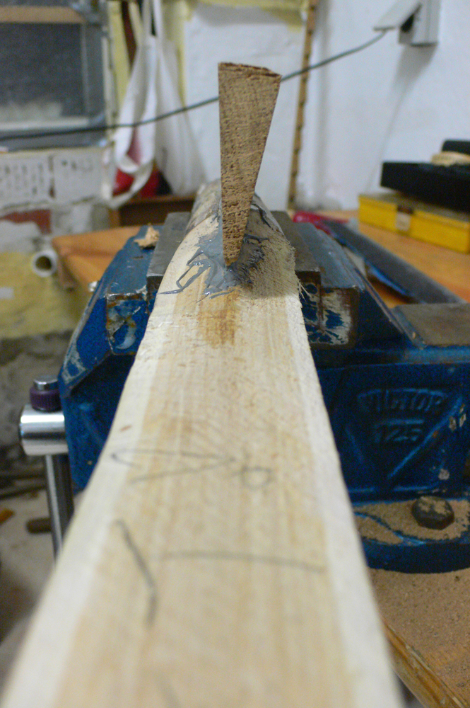 So, habe mich mal um einen Griffbereich gekümmert.Keilholz aus Eiche angepasst. Vor dem Einkleben noch eine Linie mit Superkleber gezogen, damit der noch ein bisschen in den Spalt läuft. Dann mit 2K den Keil eingeklebt. Muss jetzt bis morgen trocknen.