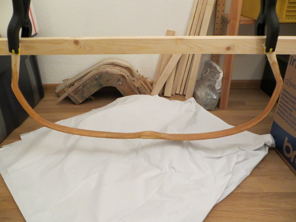 Nun ich gebe zu über die historische Belegbarkeit von Hosengummi läßt sich streiten :) Aber es geht dabei ja nicht nur darum Leim zu entfernen sondern auch darum durch das Erwärmen die Fasern nochmals gleichmäßig zu durchtränken und eine homogene Schichte aus jeweils gleich viel Leim und Sehnen herzustellen. Wenn dir Hosengummi unsypathisch ist nimm Verbandsbinden aus Baumwolle die neuerliche Erwärmung (60 Grad reichen) nach dem aufbringen der Sehnen halt ich auf jeden Fall für gut.