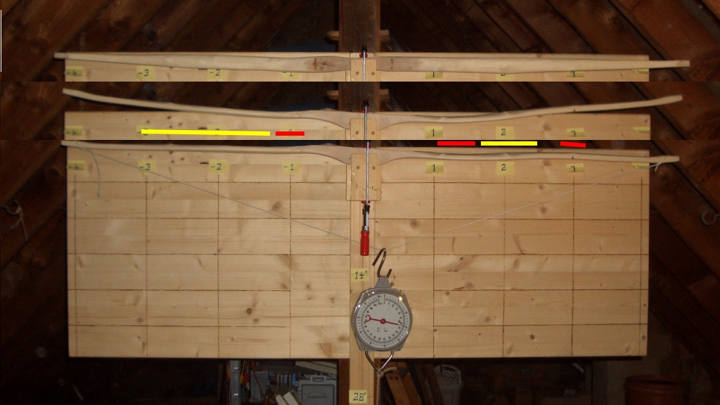 Ich hab dann den Griff etwas nachgearbeitet und so die Tips auf eine Höhe gebracht. Danach hab ich den Bogen das erste mal ausgezogen. Als die Tips auf Griffhöhe runtergezogen waren standen auf der Zugwaage schon gute 30#. Der linke Wurfarm darf insgesamt noch etwas schwächer werden. Das mach ich vermutlich erstmal über die Breite, weil er mir direkt hinter dem Fade etwas zu schmal geraten ist. Ansonsten hier meine Analyse (gelb = schwächen; rot = Finger weg)