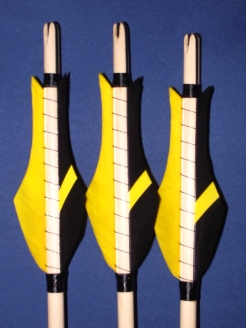 Dann haben wir Nocken geschnitz, lasiert, lackiert, geschmirgelt, Pfeilfedern geschnitten, nochmal lackiert und geschmirgelt, befiedert, gewickelt, bemalt, nochmal lackiert und zum Schluß noch Spitzen draufgemacht (soweit vorhanden).