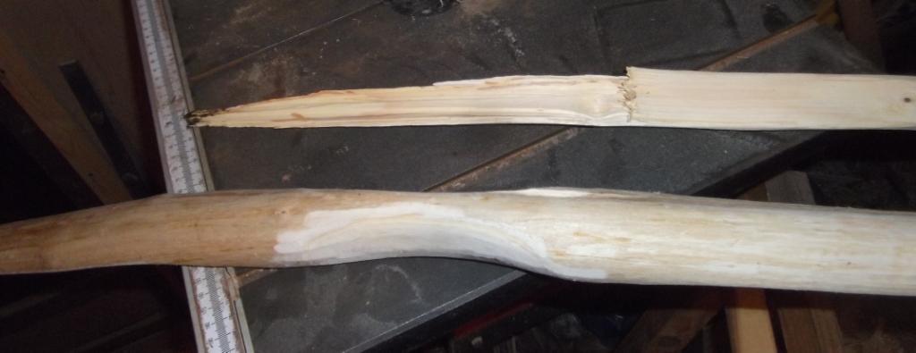 HUCH wie kann denn sowas? Für mich sieht das nach einem Holzfehler, oder nach versehentlich verletztem Rücken aus. Zu trocken war das Holz aber wohl nicht. Der sehr stark faserige, splitterige Bruch zeigt, das das Holz elastisch und zäh war.