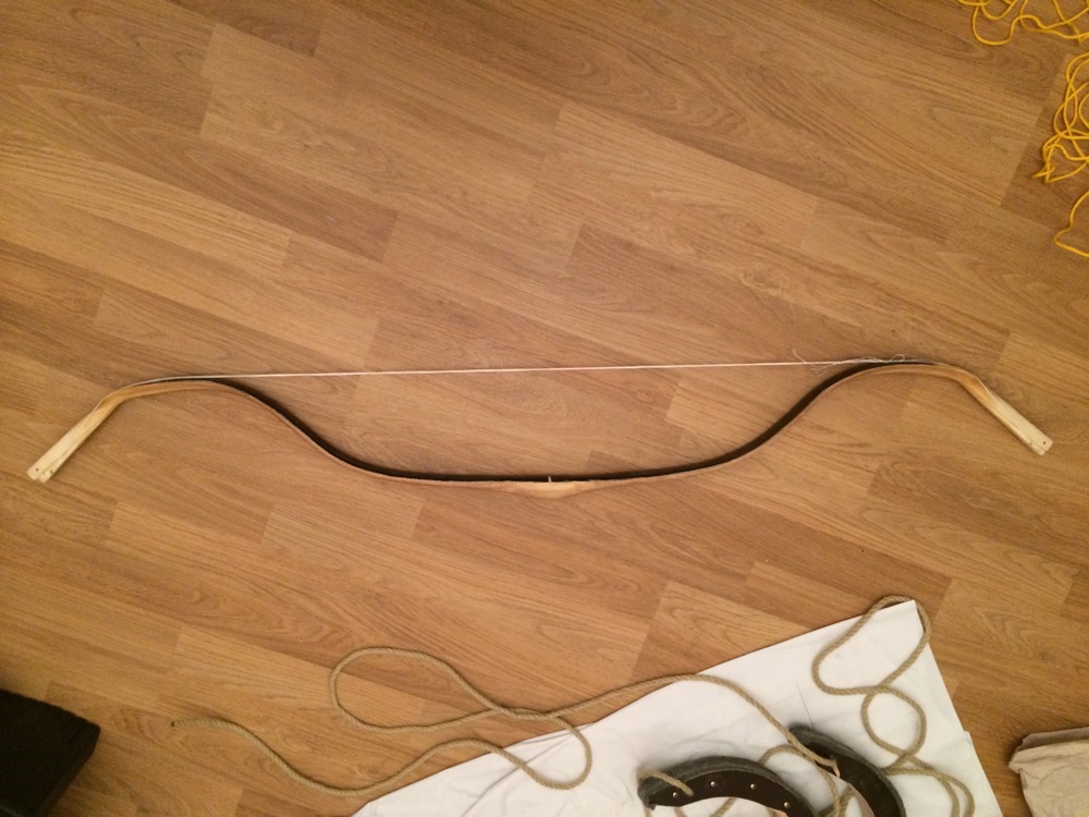 Heute habe ich schnell eine (wirklich gruselige und zu lange) Tillersehne gebastelt und den Bogen erst auf Tepliks gebogen und dann mit diesem Provisorium gespannt: